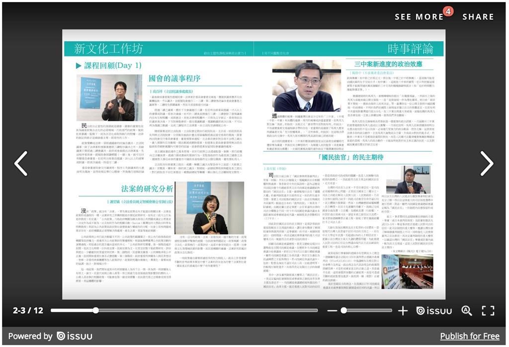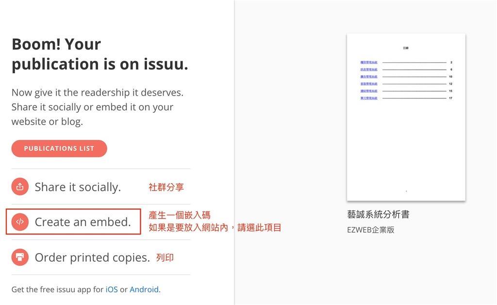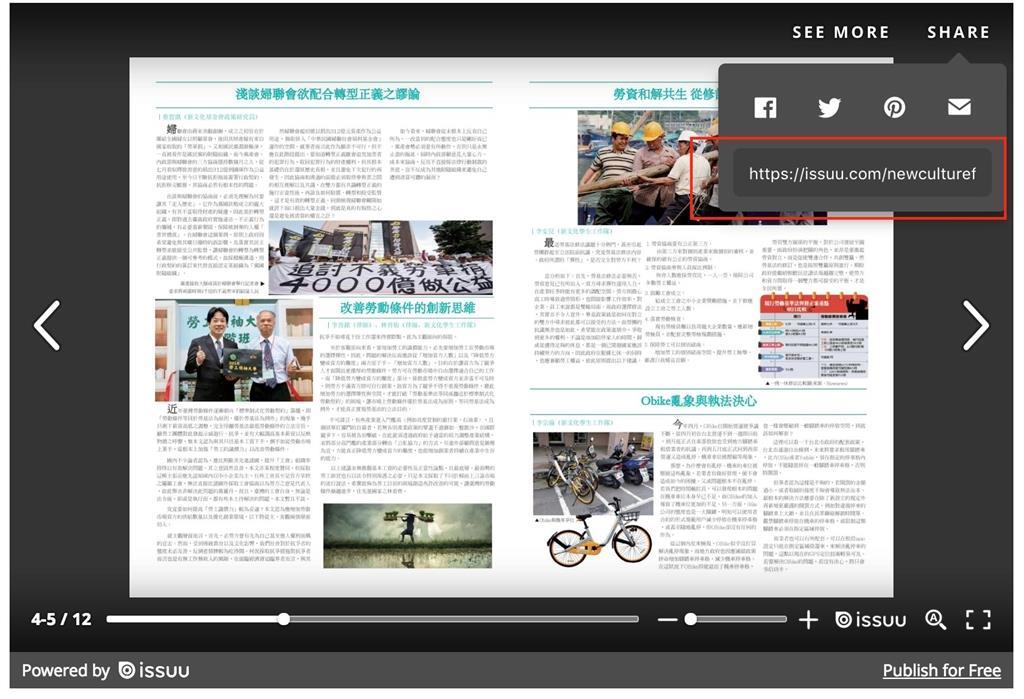 Issuu 是一個開放式的電子書平台,平台上提供了免費製作電子書的服務,當然也提供了付費後的進階服務。很適合一般 企業製作電子型錄,或是個人的作品集。製作完畢後,也會產出嵌入碼,方便放於網站當中。