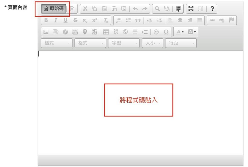 進入網站後台,在 HTML 編輯器點選【原始碼】,再將上個步驟的程式碼貼入,即可完成。