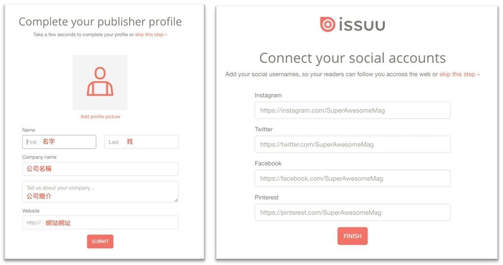 新發佈者資料-完成發佈者基本資料,如果有其他社群網站連結,也可以一起填入。