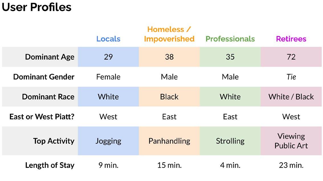 This course had us conduct a user analysis of public space over four months with no less than fourteen site visits. The results of these observations informed our assessment of whether the public space qualifies as “good public space” based on an analysis model of our creation (Carr, Francis, Rivlin, Stone).
