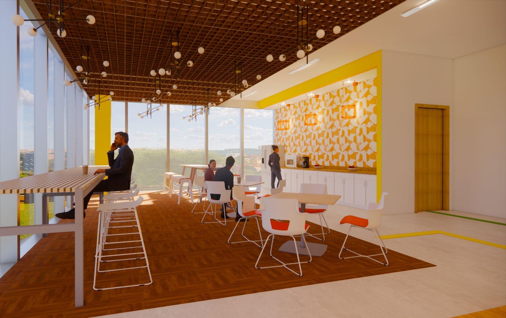 A cafe area allows space for workers to socialize, relax, or do their work in a different environment.