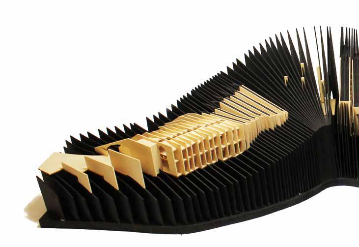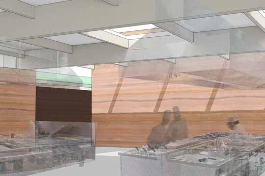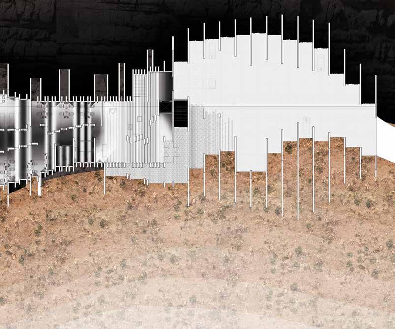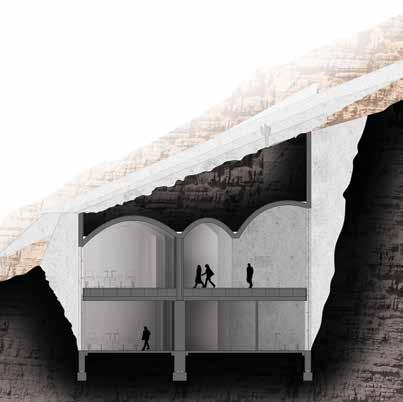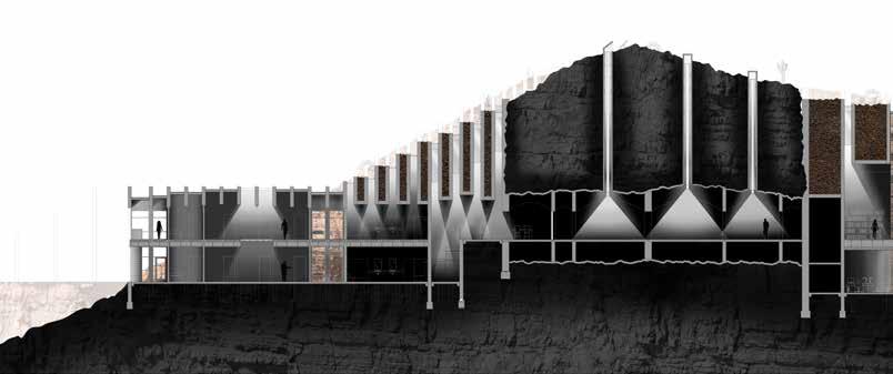 The lab is separated into two wings. the left is the residential wing where researchers can live on site. These arches are more exposed to give views to the bedrooms. The right wing has the research labs, library, and exhibition space and is also the main visitor entrance. These arches are deeper into the earth and have more controlled lighting. The two wings are connected by an excavated tunnel which serves as a dark lab that can be in complete darkness. In the event that light is needed there are solar tubes that project the light 50 ft underground.