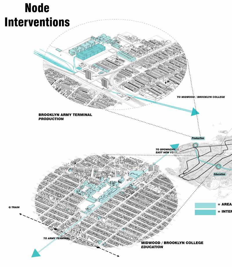 In New York City all trains lead to Manhattan. The central island contains most of the jobs in the city, making Brooklyn residents highly dependent on the train system. But what if Brooklyn could be strengthened from within? If there were nodes of commerce and the available education for any type of small business, then there would be less need to travel to Manhattan everyday. In this studio we were challenged to rethink the systems in place in New York City and to redefine what it means to live and work in Brooklyn.