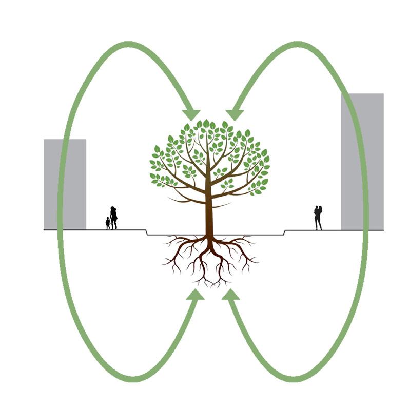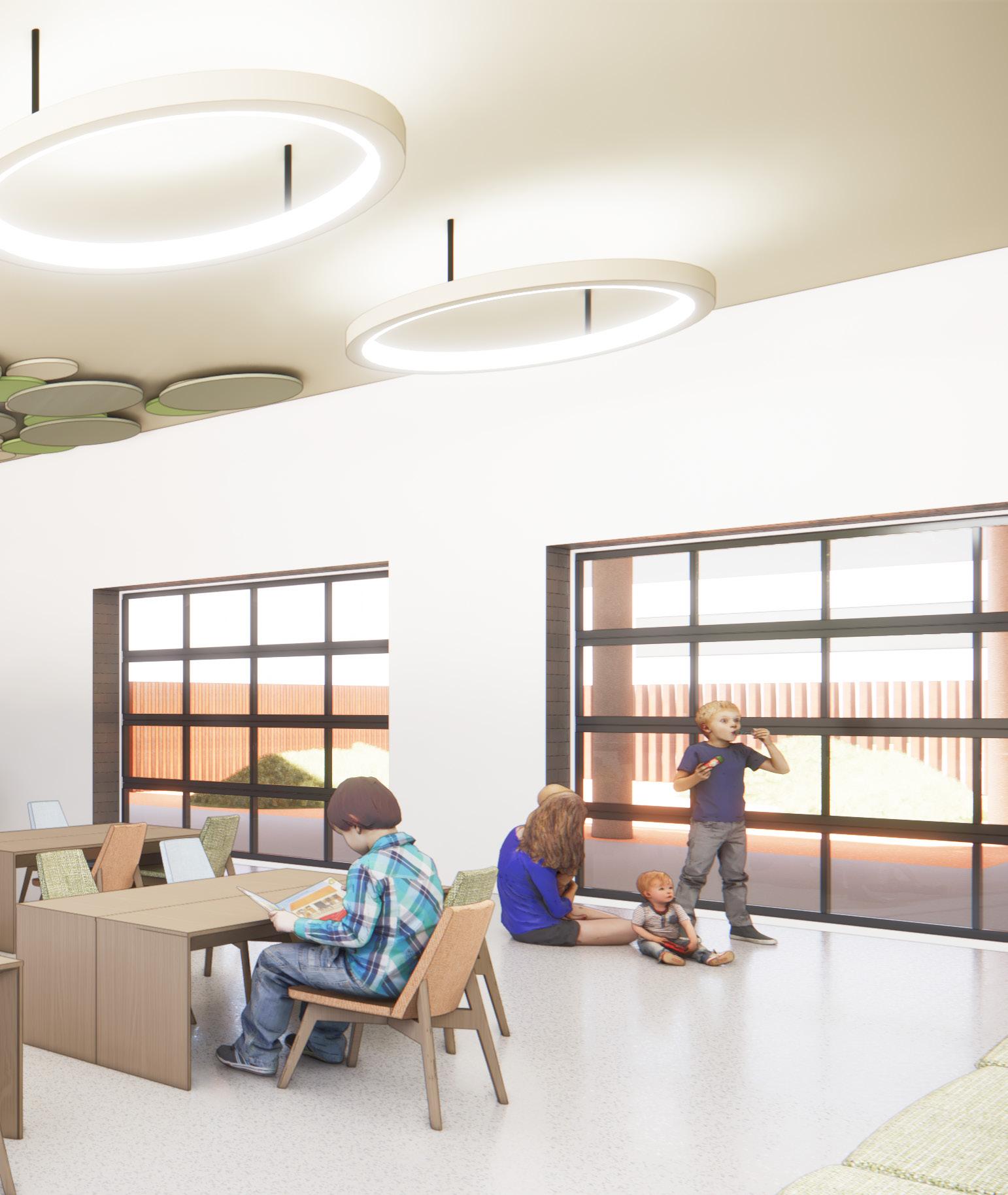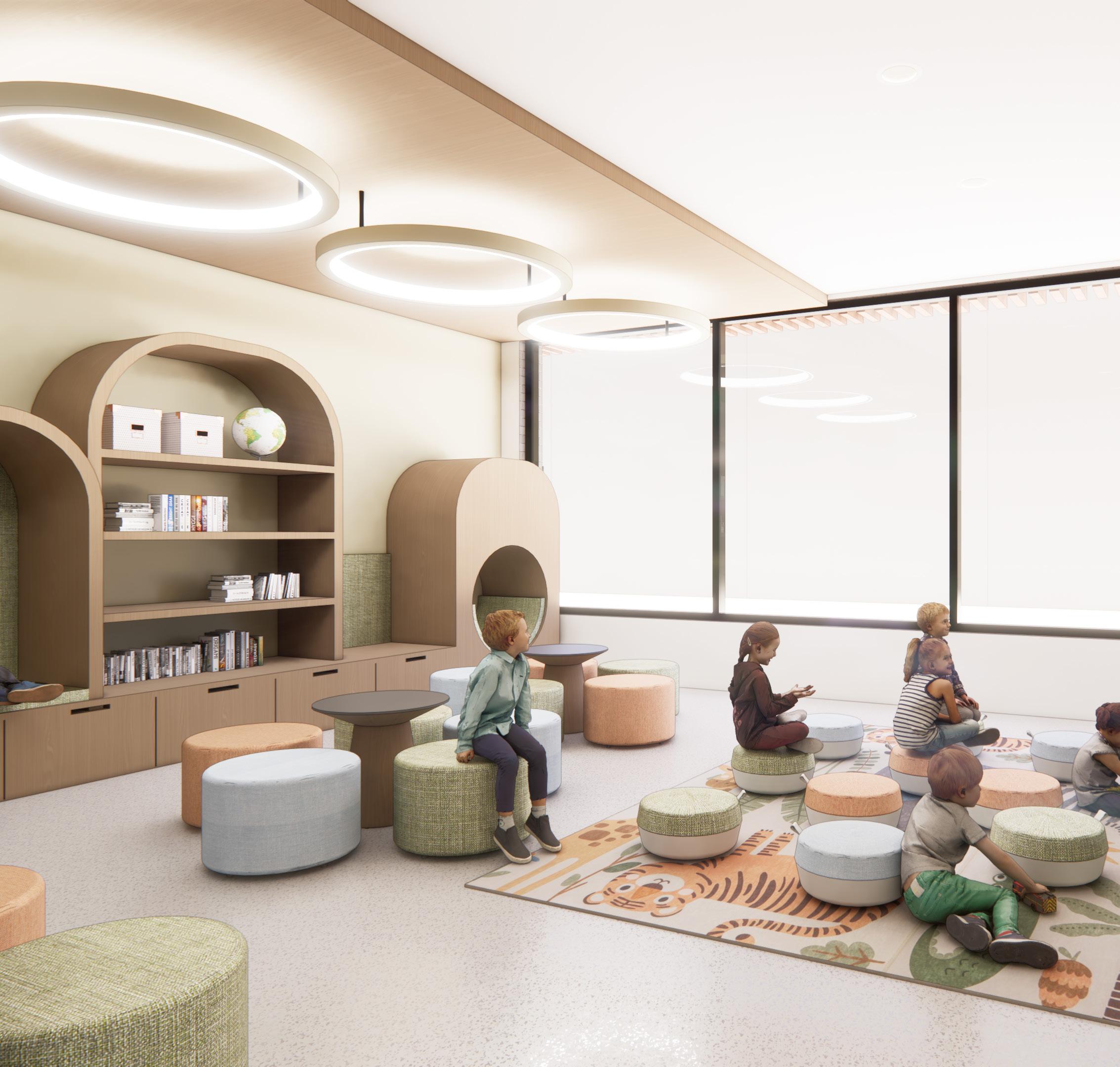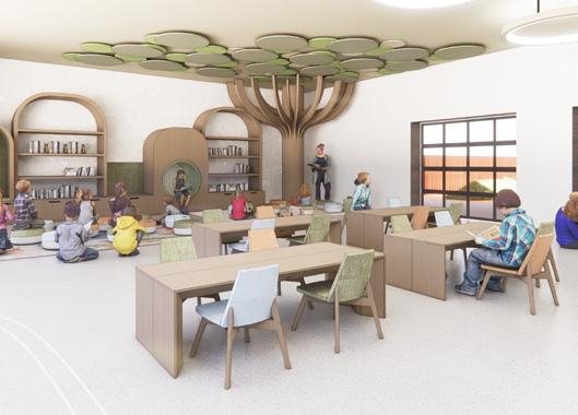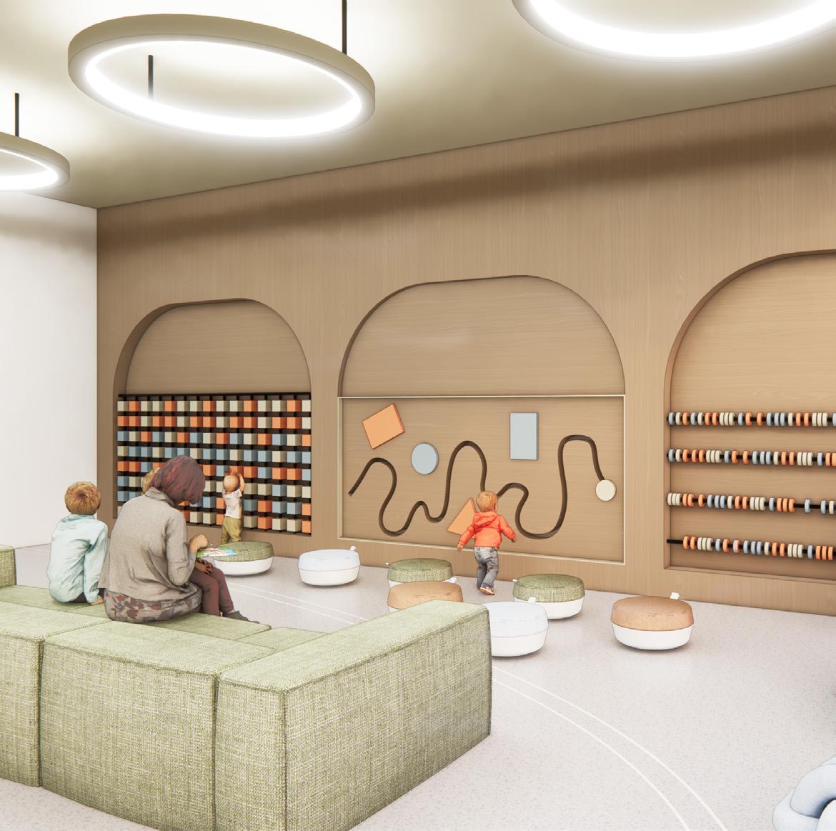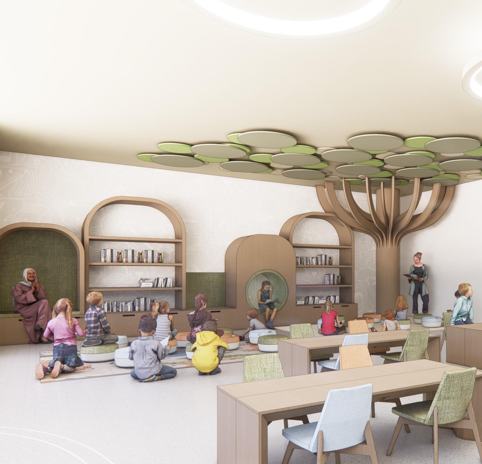 The concept diagram reinforces Growing Together by illustrating shared roots and continuous cycles of growth between parents, children, and the community. This idea is reflected in the material palette through natural textures, warm wood tones, and layered finishes that represent stability, connection, and change over time.
