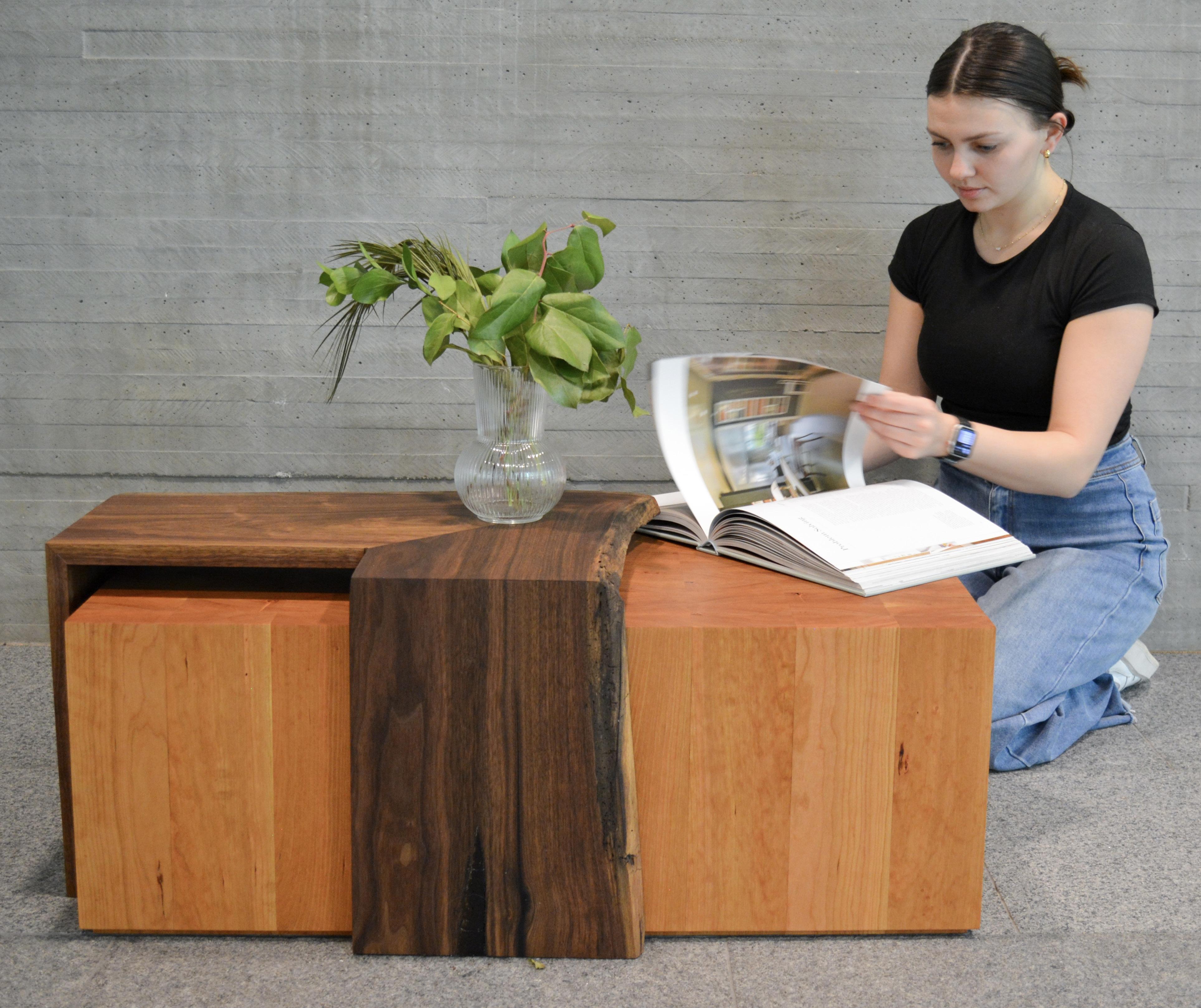 The goal for this furniture piece was to create a coffee table that was sturdy, easy to rearrange, and have places to put drinks and work on. I created a very simple rectangular shape main table that was created using many pieces of cut and joined cherry wood dominoed and glued together. I then designed an addition to the table out of walnut. This piece has a live edge and is made to be able to pick up and move around depending on how the table is placed in the space. Overall, I created a table that is simple and pleasing to the eye with multiple uses for a space.