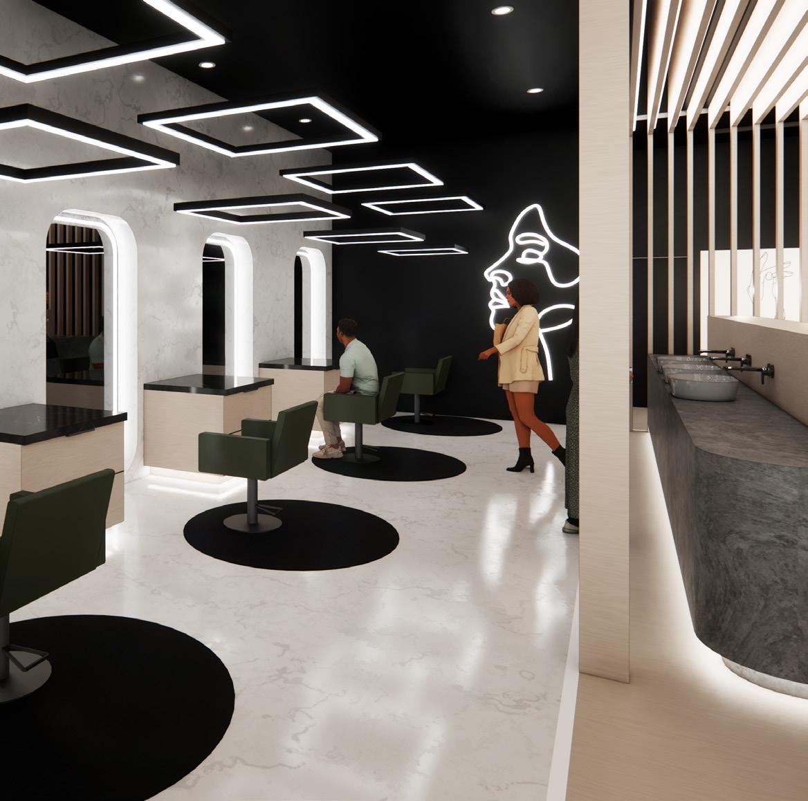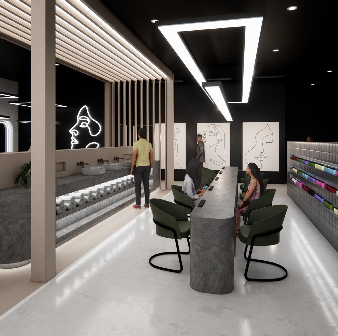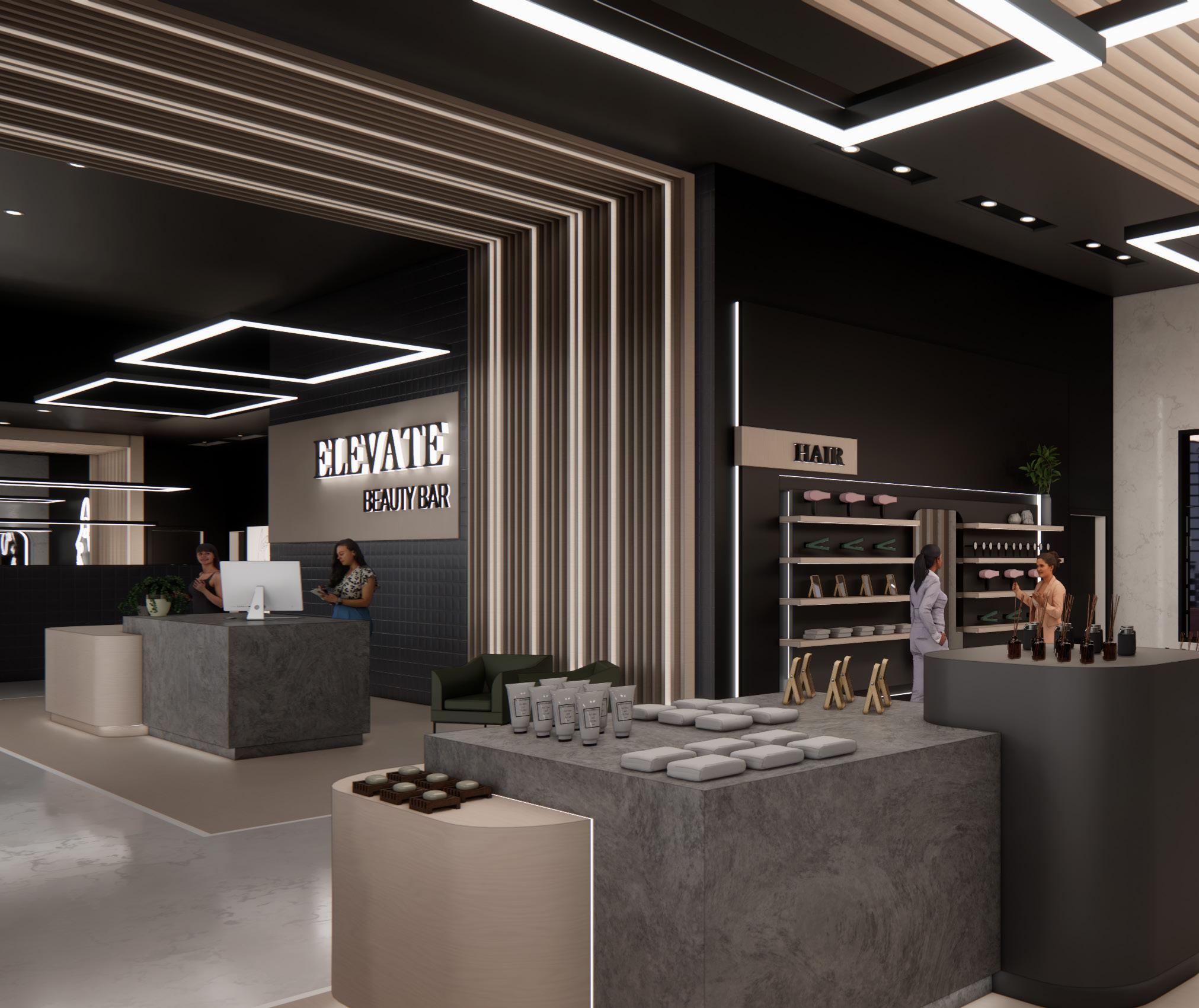Embracing the concept of layers, Elevate offers a multidimensional experience that celebrates the natural glow of hair, skin, and nails. The salon’s design draws inspiration from the interplay of light and darkness, creating a harmonious contrast that highlights the beauty of each individual. Through intricate sculpting of walls and strategic use of materials, forms are carved out to reveal and enrich the space. Layering structures within the walls and ceilings contrasts solidity and airiness, creating visual intrigue. Lighting is carefully orchestrated to illuminate the various dimensions, while the interplay of colors and textures defines the space, imparting a luxurious, multi-layered ambiance.