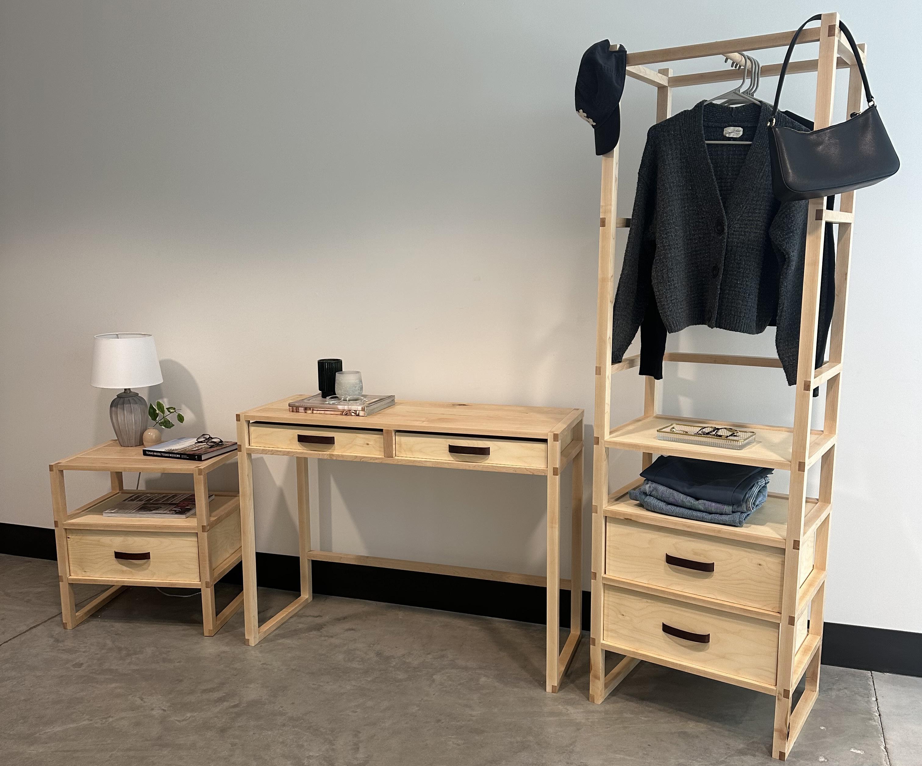 The goal for these furniture pieces was to create a modular and flexible bedroom set that could easily adapt to different spaces. In collaboration with two classmates, we designed cohesive pieces that respond to the needs of small living environments. We designed three components: a nightstand, a console table that doubles as a desk, and a clothing and storage rack that can be reconfigured in various arrangements. Together, the set offers versatility not only for the bedroom but also for other areas of the home.