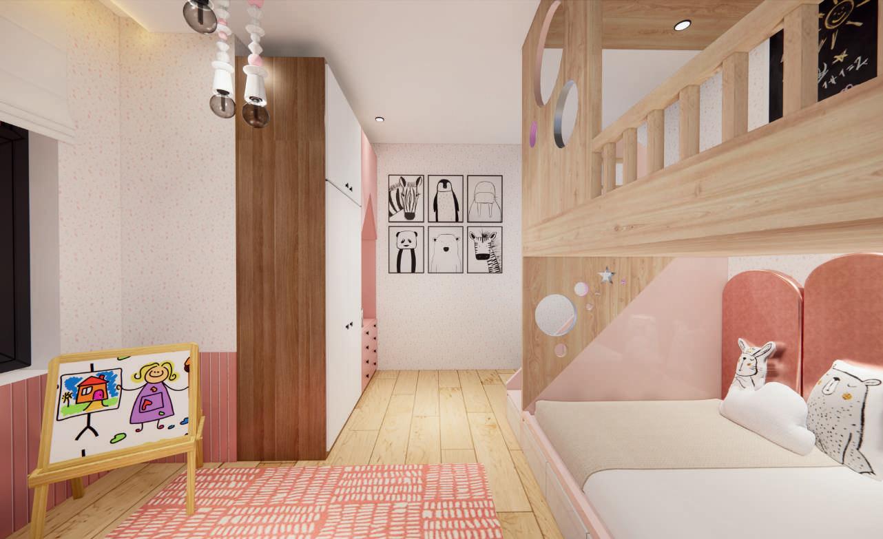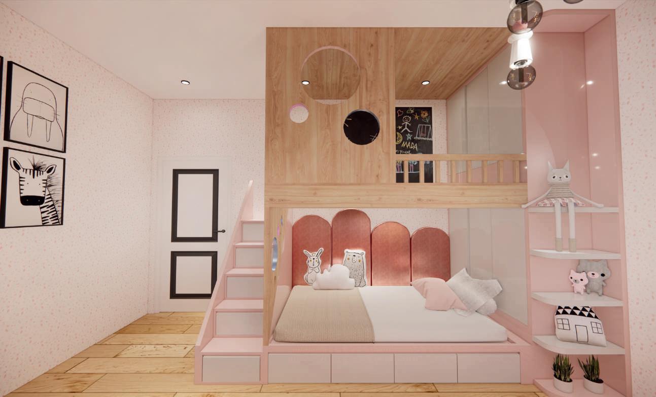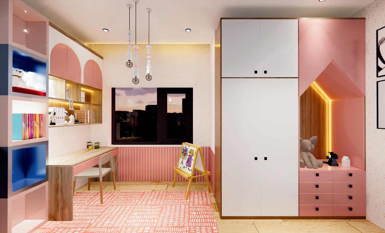 This project creates a bedroom design with a girl's theme. Using a pink thematic concept and furniture that has closed cabinets to keep it neat. The bed is made of tiers so that the top can be used as an area for the girl to paint.