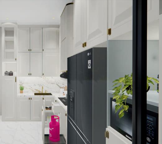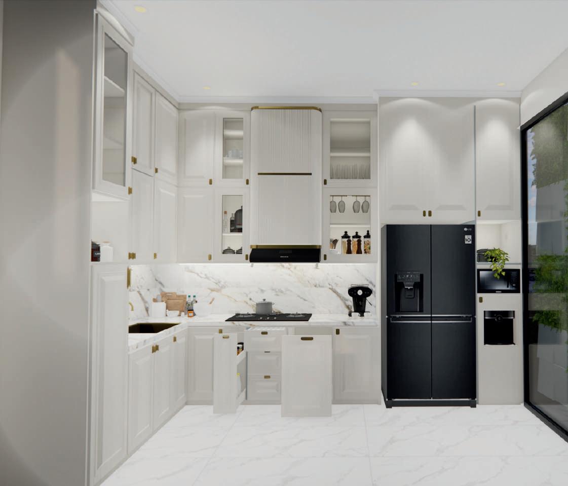 Theconceptofthiskitchenisadjustedtoclient’srequest.UsingAmericanclassicstylewithgold liststoaddtheaccent.Theuseofneutralcolorsisintendedtomakethearealooksclean.