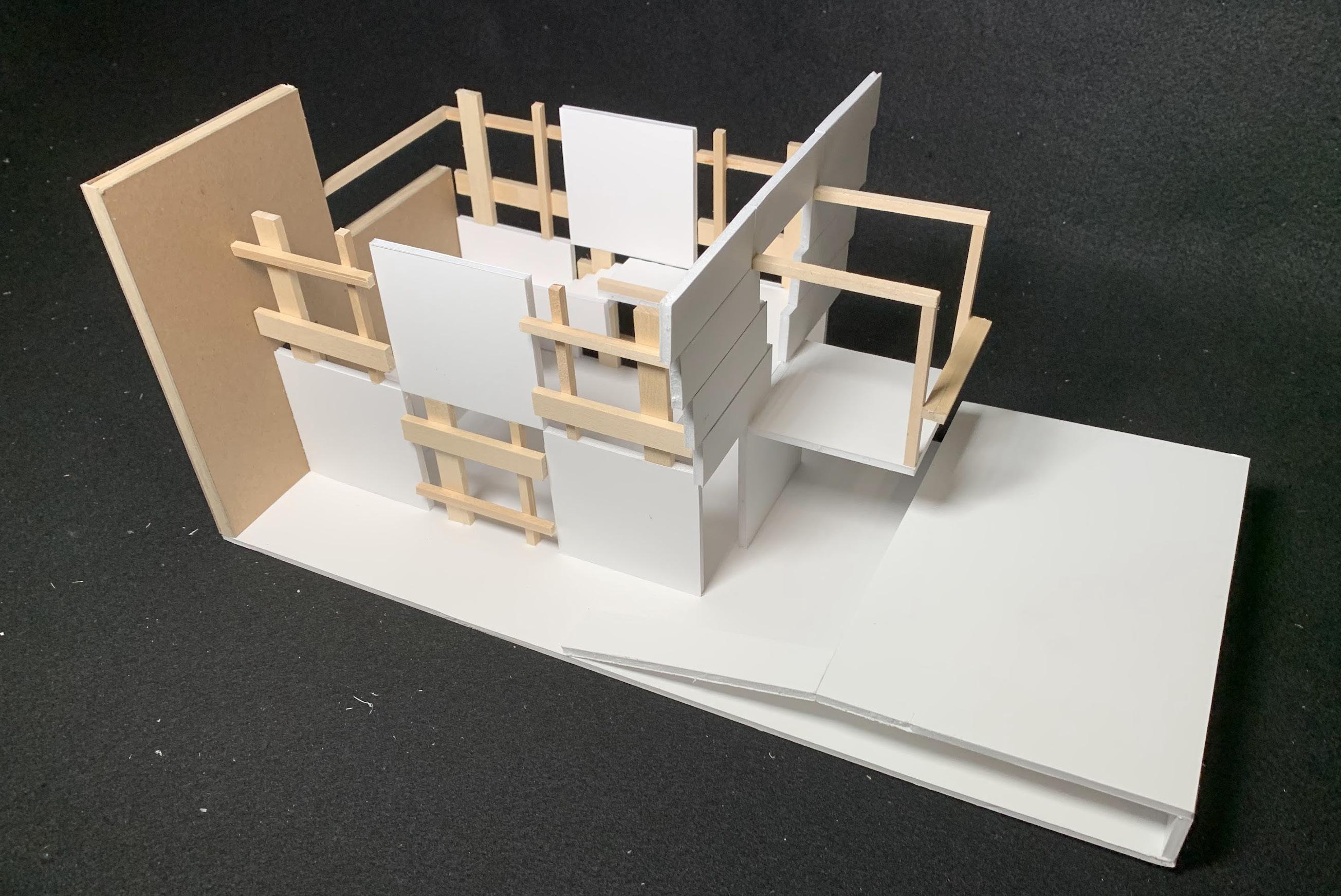 I created a space off of a wall from a room in our architecture building. There was creative liberty here to create almost anything we would like, just nothing crazy like water features or aquariumsc. On top of this task was the struggle of shortage of materials. We had a kit of parts that we were allowed to use, and not a piece more. With our kit of parts we had to create some sort of spatial journey. I decided to create an art museum with the walls looking like little easels. It was quite difficult with the shortage of materials so I created a chart that let me keep track of all of my pieces. My art museum included an outlook to an outside sitting area where visitors would enjoy a picnic on the grass after looking at all the artwork.