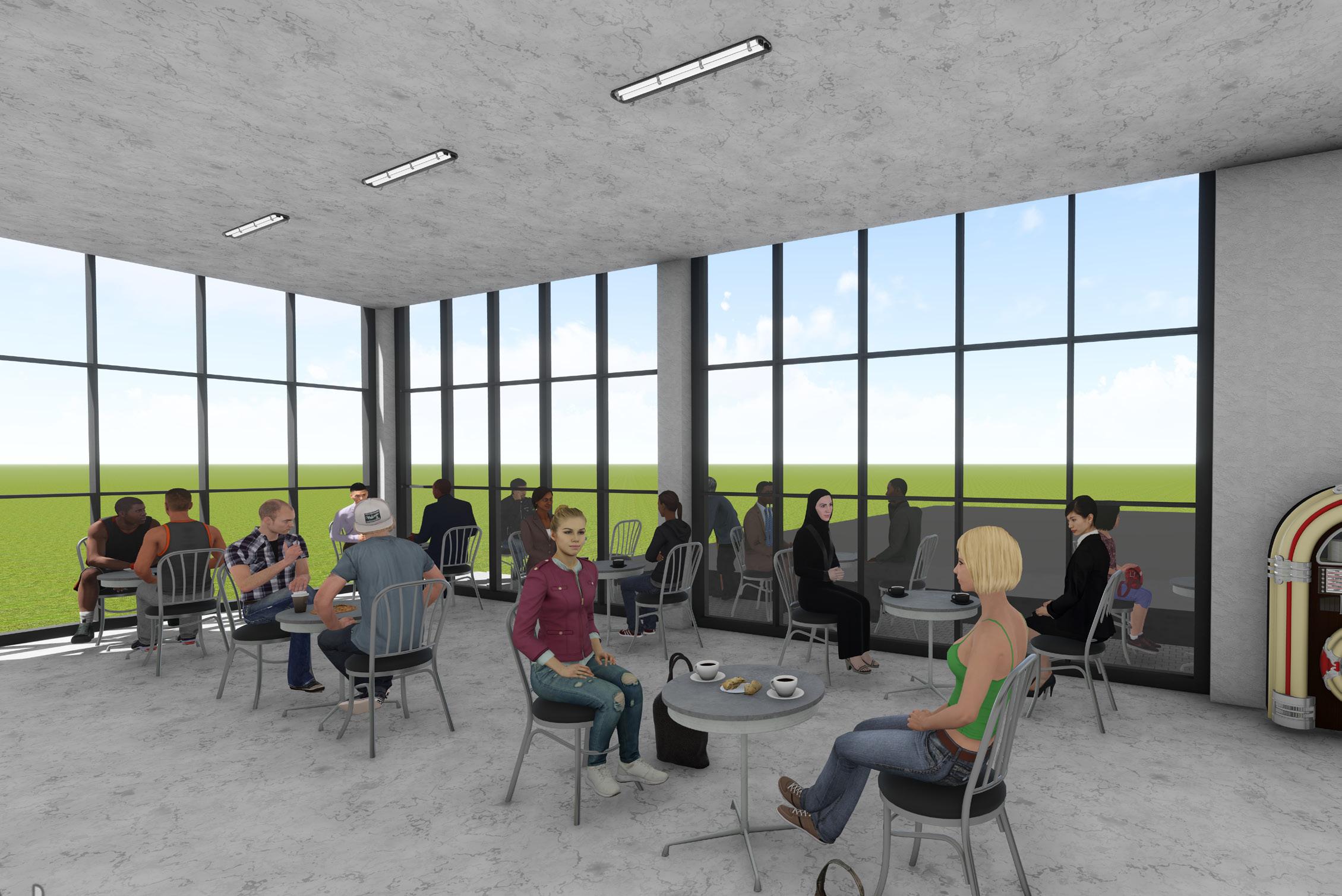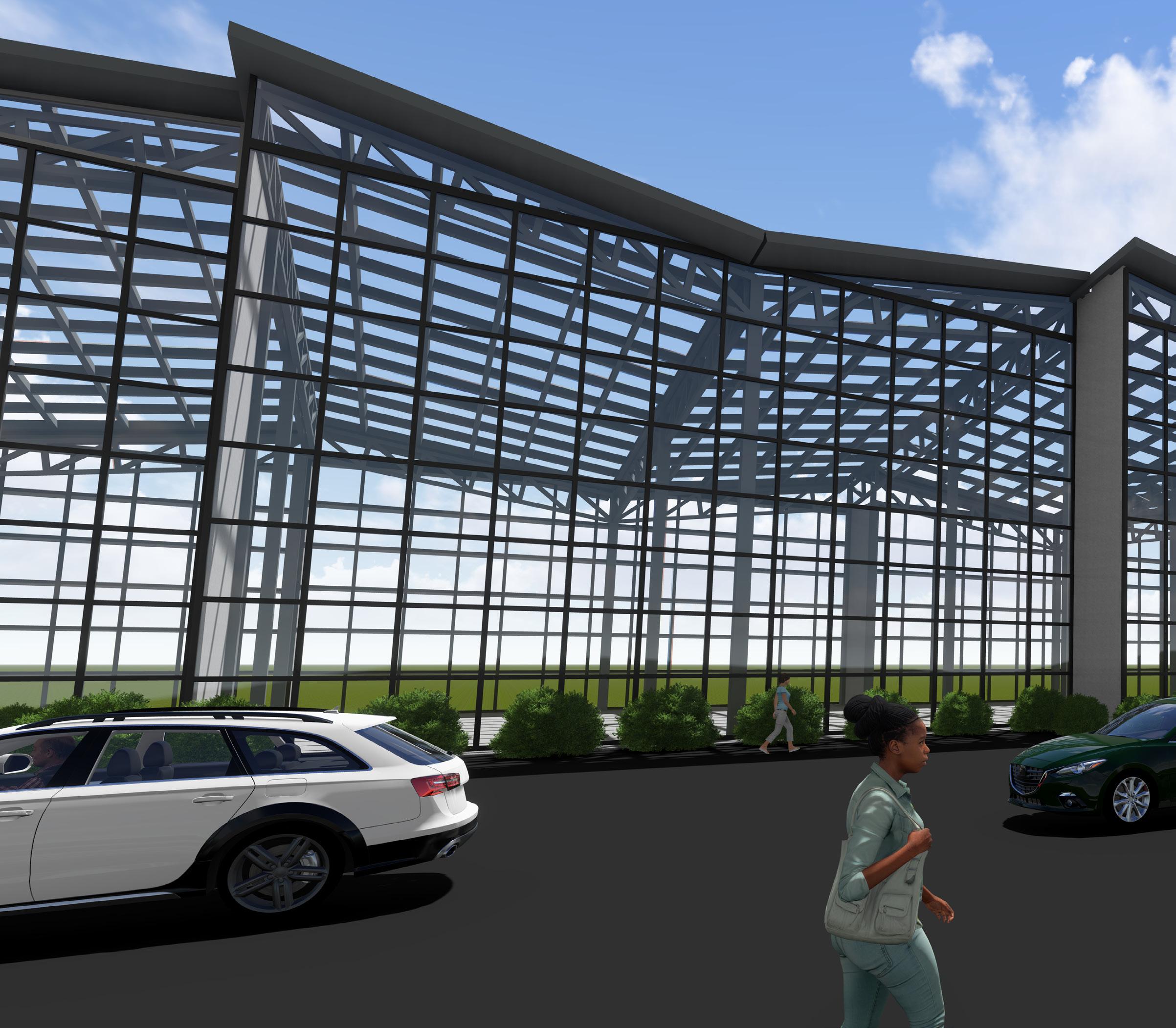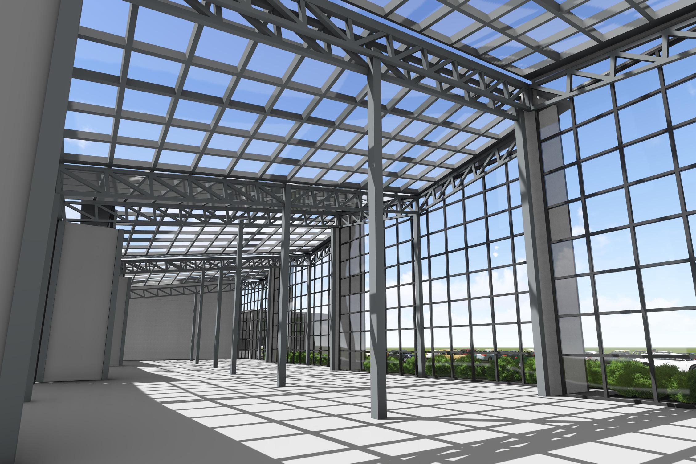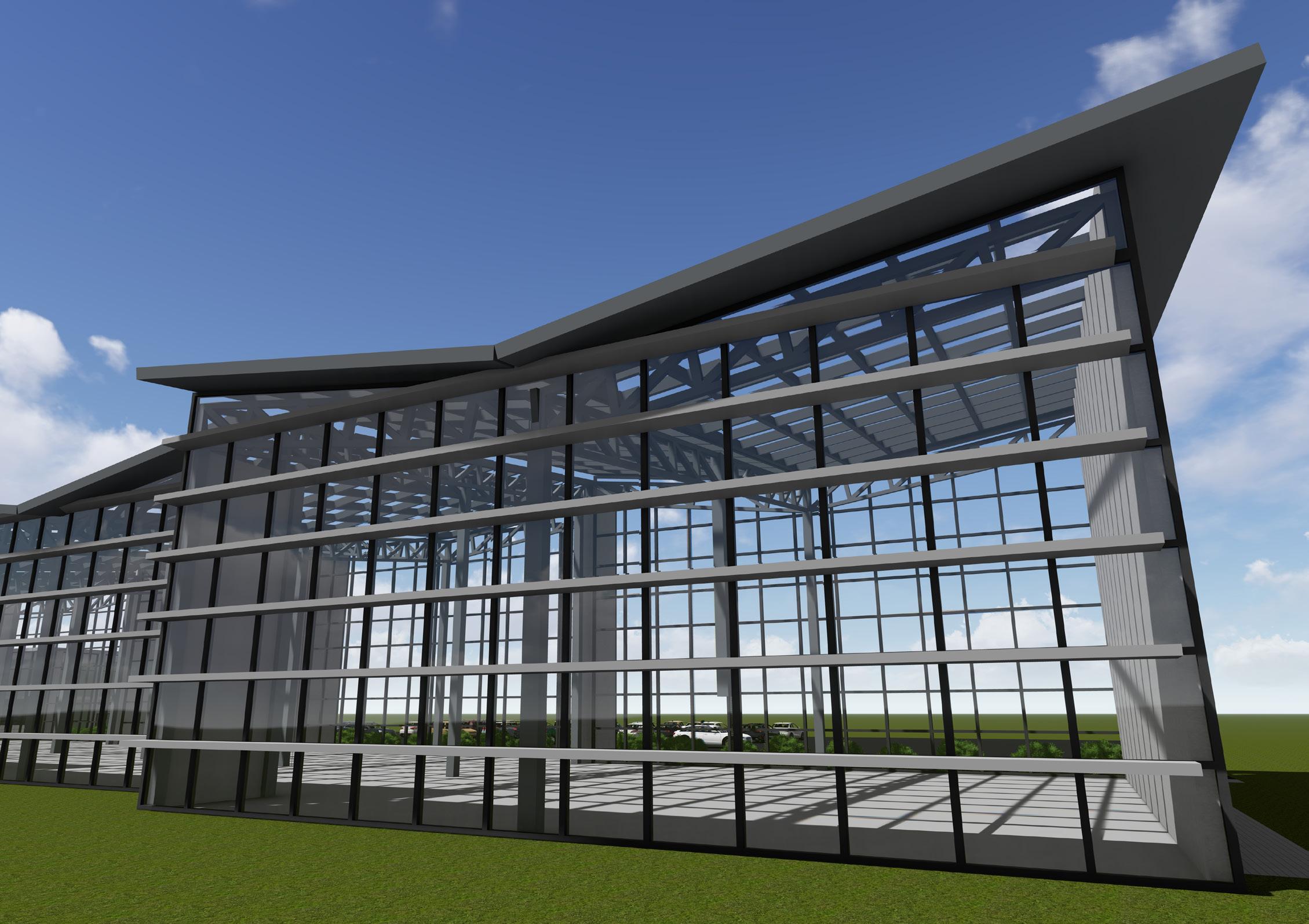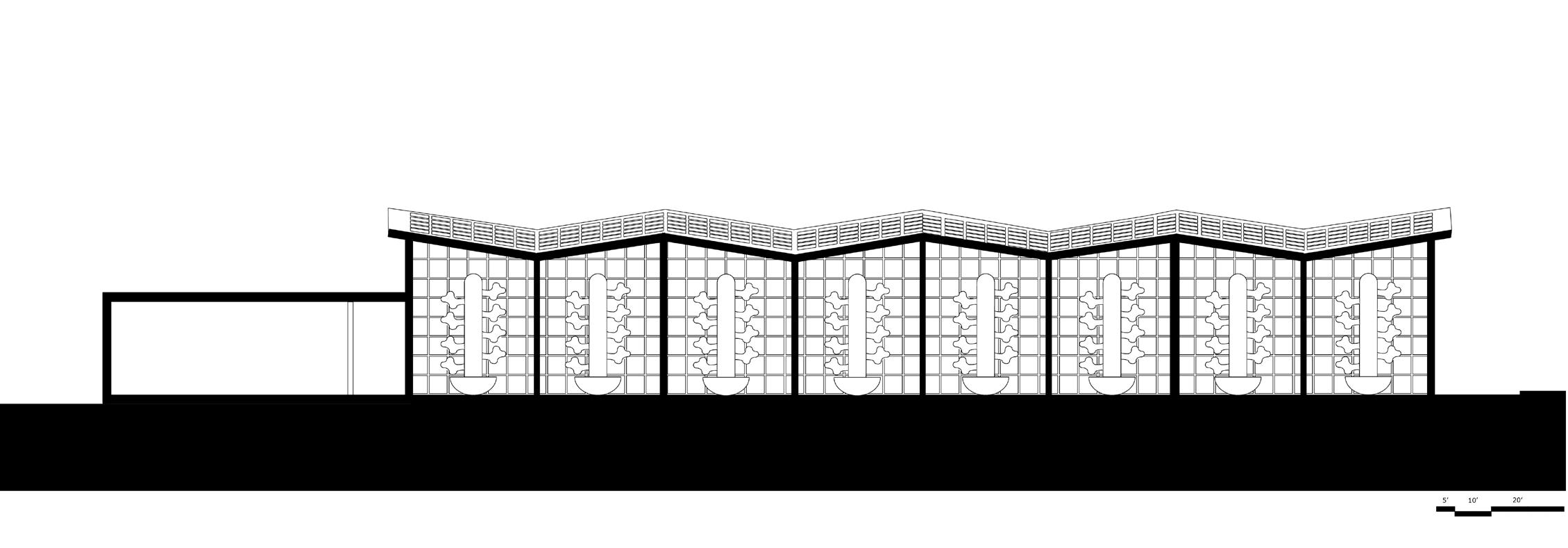 more land as they are trying to accommodate for more people as the population exponentially increases. enough food. In response to this issue, our class created a vertical urban farm. During my design process, greenhouse. Our task was to create 25,000 square feet of space. To break that enormous number up, the areas, the public areas, the office areas, and the processing areas. In addition to this program, we were our greenhouse. My design focuses on visually separating the greenhouses into 4 different spaces, practicality reasons. With environmental preservation in mind, I created butterfly roofs that would push the water to flow in one big stream down the roof and to the back of the building, which was out of the recycling rain water and using said water to then grow the vegetation inside. As the roof had to be made the plants from the sharp sun rays, but not too dark or the plants would not be able to flourish under not was sun shelfs on the back of the building (south side) as the sun moves throughout the southern sky. Lastly, natural air ventilation.