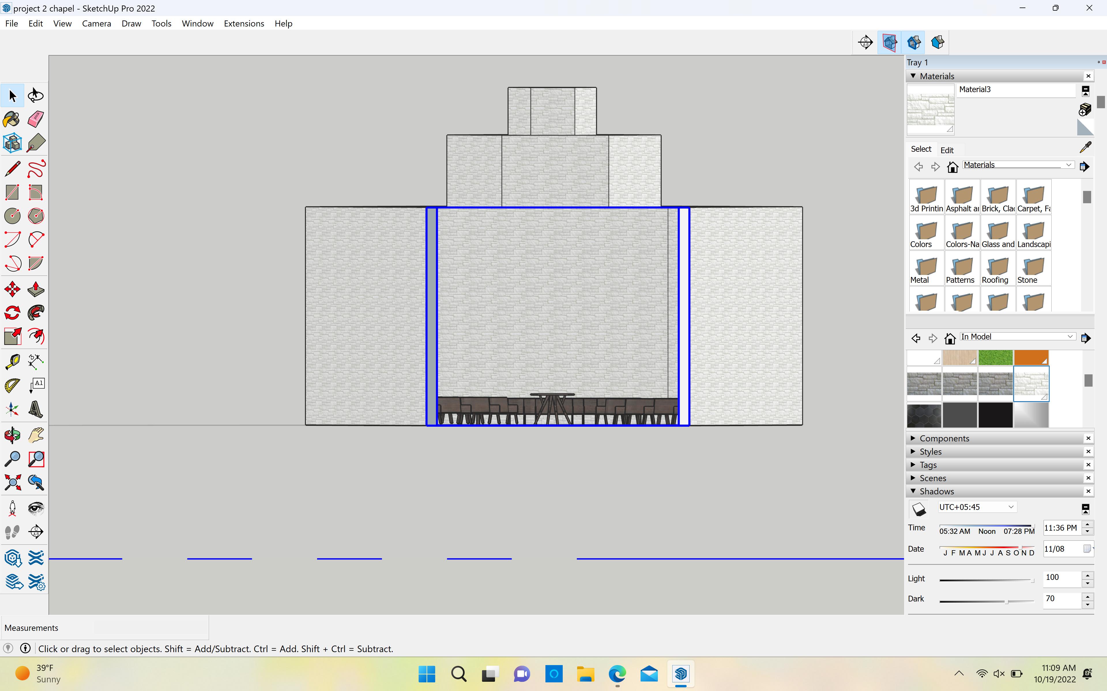 would feel as if something is missing. It is a fairly small cemetery west of Iowa street. The solution to this would be a columbarium space and a meditation chapel. When looking through precedents, I found these played around with the hexagon and connected a bunch together, which created my design. Connecting courtyard in the middle. For my chapel, I wanted the hexagon idea of the columbariums to also fit into my hexagonal space for the chapel space, and had the lobby area be a rectangle. It was nearly impossible to make the process was to create a design that coexists nicely with what is already there. This made the materialexisting material was light concrete. For my columbariums, I decided to make them out of White Carrera Marspace. For my chapel, I decided to make the exterior white limestone to go along with the light concrete, lightness to the chapel, which brings for contemplation.