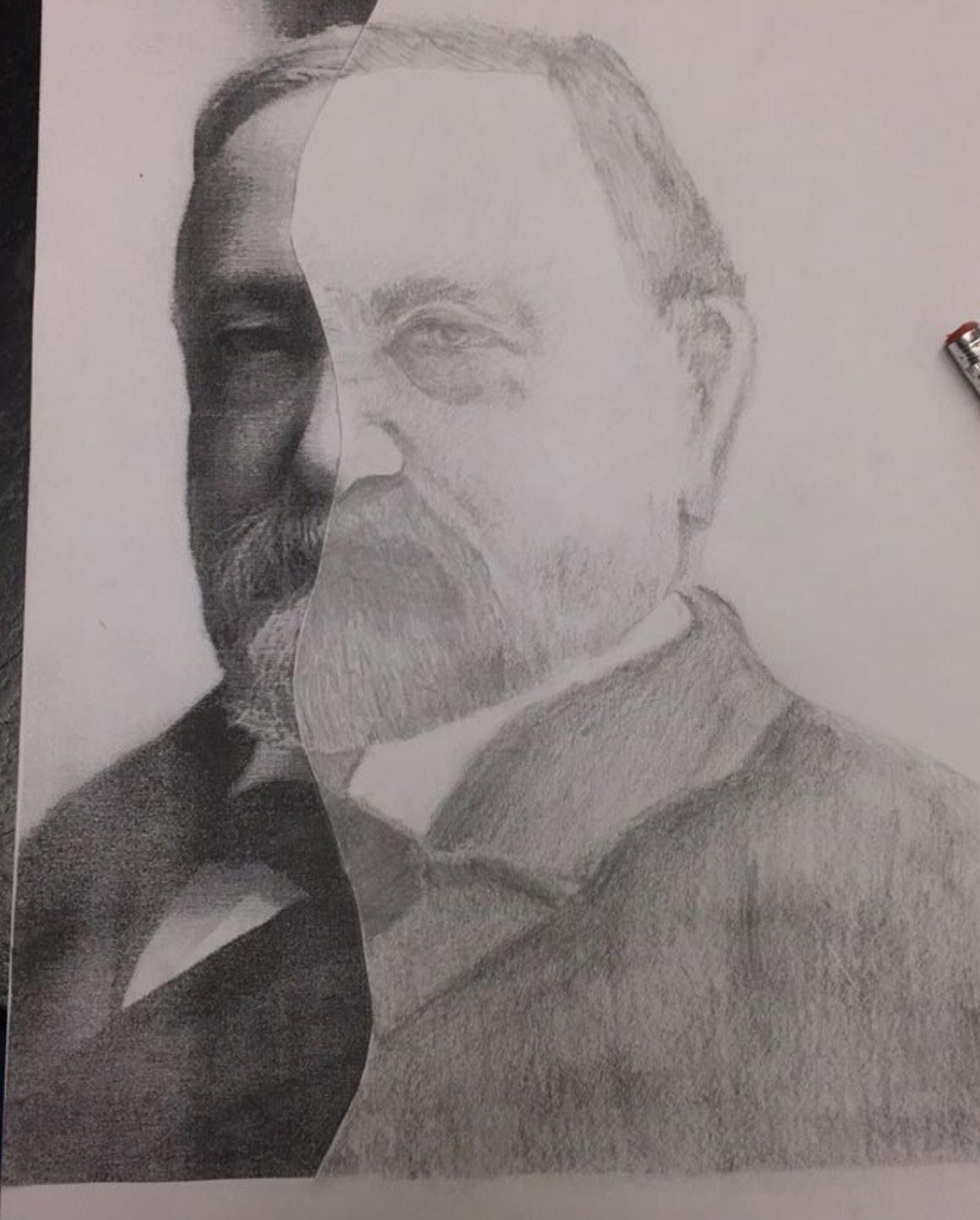 Here is a picture of Benjamin Harrison that I drew in 7th grade. The left side is printed, and I had to draw the other side and make it look as realistic as possible