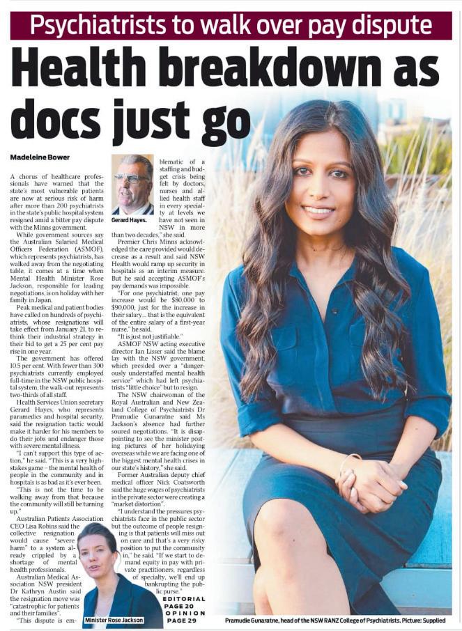 For those working in our public hospitals, particularly our doctors in training, the grinding despair of an award that is generations out of date. For our public sector psychiatrists, watching in their under-resourced hospitals as the sickest and most marginalised patients are forgotten.