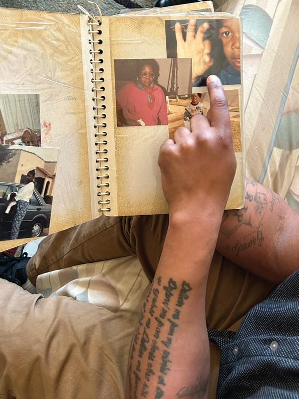 Ammons looks through one of the many photo albums at his mother’s house. He lingers on a photo of himself, at about age 8. “That’s me throwing up gang signs early,” he laughs. RIGHT: Anthony Ammons reads one of the letters his mom wrote to him in prison. One of her letters, dated September 2003, starts with, “Dear Anthony, How’s mommies [sic] baby doing?”