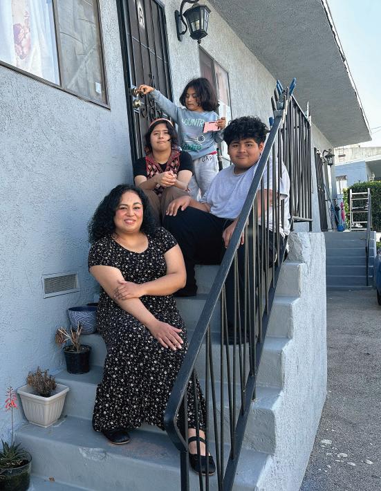 Araceli Del Rio sits with her three children (clockwise from left), Serenity, 17, Lionel, 7, and Sonny, 13, on the front steps of her Monterey Park childhood home, where they currently all live.