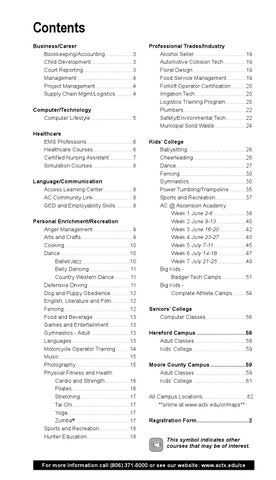 Professional Trades/Industry Alcohol Seller..................................19 Automotive Collision Tech...............19 Floral Design...................................19 Food Service Management.............19 Forklift Operator Certification..........20 Irrigation Tech..................................20 Logistics Training Program..............20 Plumbers.........................................22 Safety/Environmental Tech..............22 Municipal Solid Waste.....................24 Kids’ College Babysitting.......................................26 Cheerleading...................................26 Dance..............................................27 Fencing...........................................30 Gymnastics......................................30 Power Tumbling/Trampoline............35 Sports and Recreation....................37 AC @ Ascension Academy Week 1 June 2-6......................38 Week 2 June 9-13....................40 Week 3 June 16-20..................42 Week 4 June 23-27..................43 Week 5 July 7-11......................45 Week 6 July 14-18...................47 Week 7 July 21-25...................49 Big Kids Badger Tech Camps.................51 Big Kids Complete Athlete Camps.........54 Seniors’ College Computer Classes...........................56 Hereford Campus.................................58 Adult Classes..................................58 Kids’ College...................................59 Moore County Campus........................59 Adult Classes..................................59 Kids’ College...................................61 All Campus Locations..............................62 **online at www.actx.edu/cr/maps** Registration Form...................................2 This symbol indicates other courses that may be of interest.