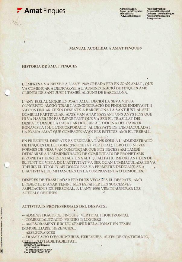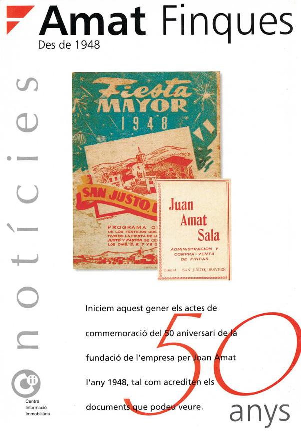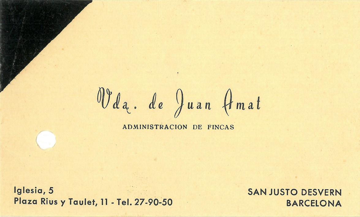 Amat nace en 1948 cuando un joven –hoy llamaríamos emprendedor–, Joan Amat, de 24 años y con estudios mercantiles, pone en marcha en su casa de Sant Just Desvern y en Barcelona un despacho profesional de administración de fincas. Cuando Juan decide emprender todavía es la posguerra, están las llamadas “cartillas de racionamiento” pero, a pesar de esta situación, decide establecerse apenas un año antes de casarse con su prometida, Concepció
