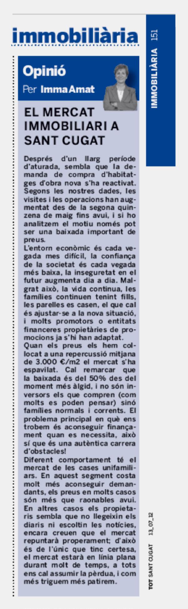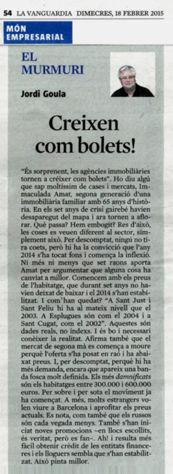 Empezamos de nuevo a vender promociones sobre plano, las primeras en Badalona, Sant Just Desvern y Sant Cugat del Vallès, no sin cierto miedo, tanto por parte del promotor como por nuestra parte. Nos preguntamos si realmente los pisos se venderán. Se venden. Primero poco a poco, pero toman velocidad a medida que los edificios se van construyendo. Al finalizar las obras, un 80% de las viviendas están vendidas, también ayuda a que las hipotecas tengan intereses bajísimos.