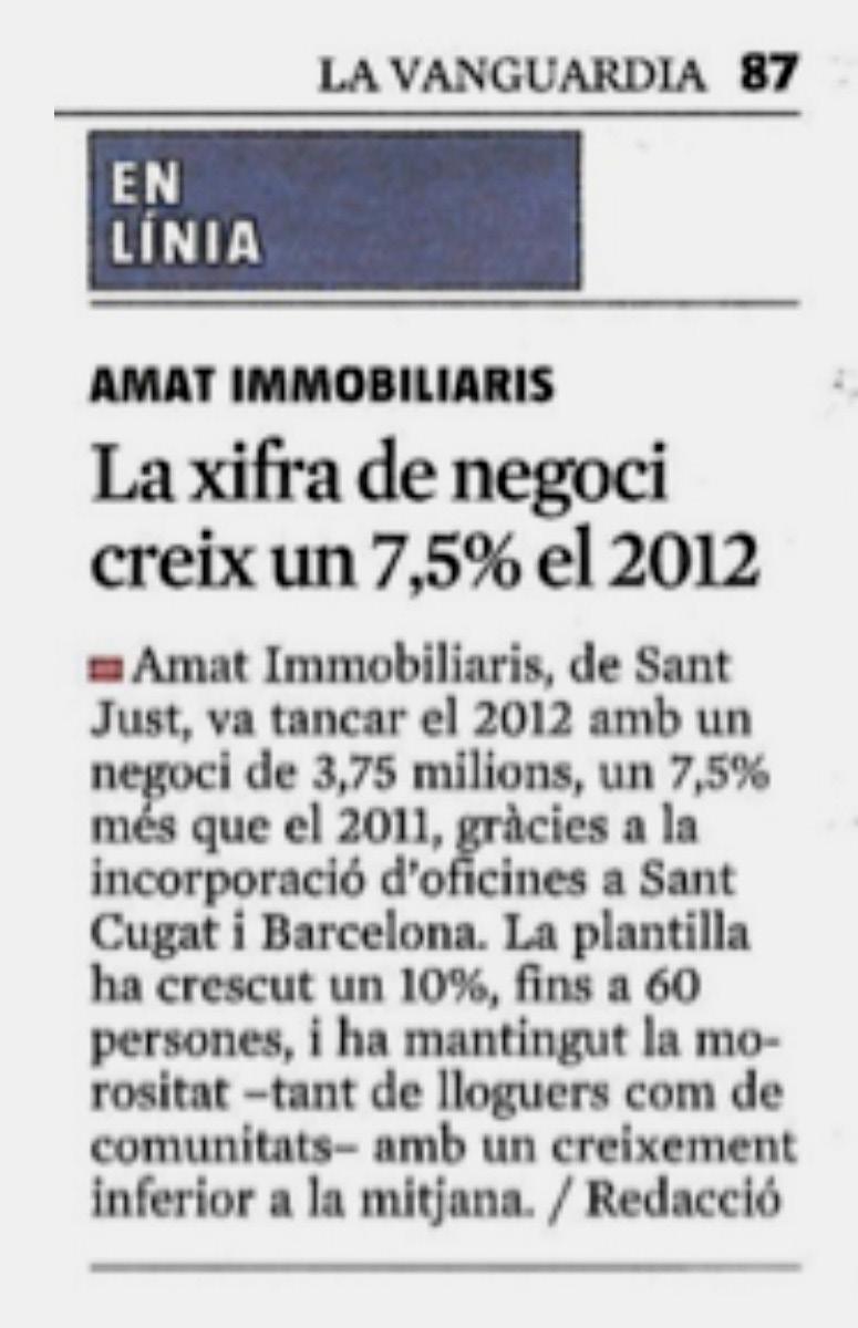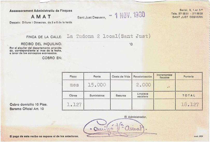 Como novedad en cuanto a comunicación, Amat alquila un espacio en la fachada de La Granja Carbonell frente al Mercado de Sant Just para instalar una vitrina con el fin de poder anunciar los pisos y casas de alquiler. Para ello, es necesario un pequeño proyecto y pedimos licencia al Ayuntamiento.