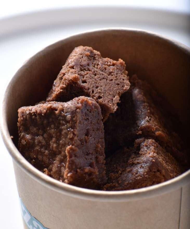 Harina integral, harina de avena, cacao, eritritol, huevo, nueces, ganache de chocolate sin azúcar.