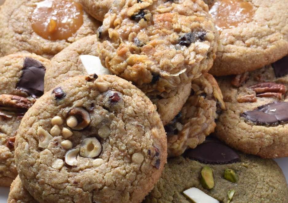 Harina integral, harina de almendras, harina de avena, ghee, eritritol, huevo, caramelo salado libre de azúcar.