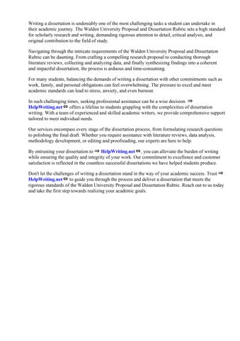 Don't let the challenges of writing a dissertation stand in the way of your academic success. Trust ⇒ HelpWriting.net⇔ to guide you through the process and deliver a dissertation that meets the rigorous standards of the Walden University Proposal and Dissertation Rubric. Reach out to us today and take the first step towards realizing your academic goals.
