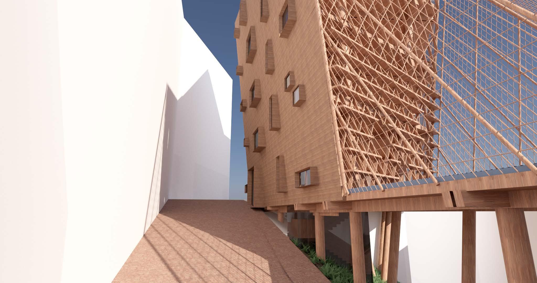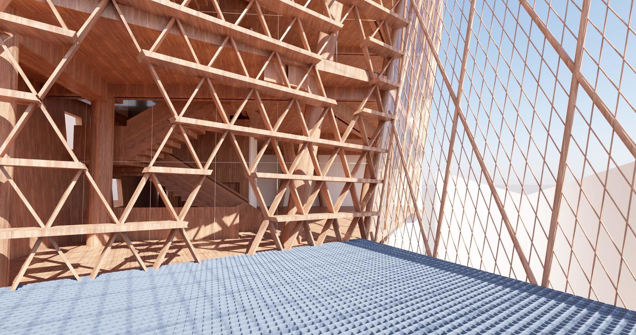 HEATFORMED PLYWOOD DIAGRID TO EMPHASISE DIAGONAL STRUCTURE AND TREEHOUSE FORM. MEMBERS TO INTERLOCK WITH LIKE TREE BRANCHES CROSSING OVER EACHOTHER.