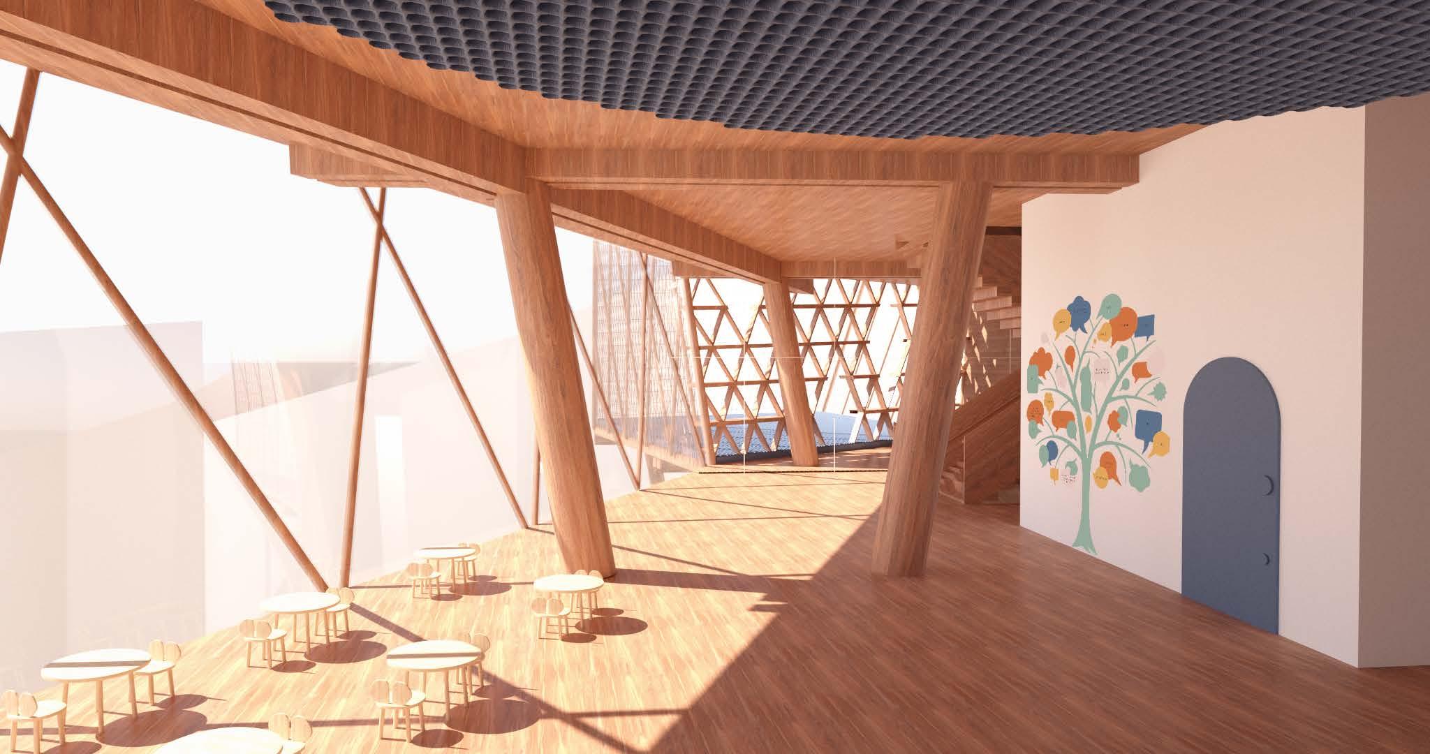 MASS TIMBER CONSTRUCTION FOR VISUAL WARMTH AND TO HELP MEET LBC GOALS. TIMBER COLUMNS TO ACT AS THE ‘TREE TRUNKS’ FOR MOUNTAIN MUNCHKINS.