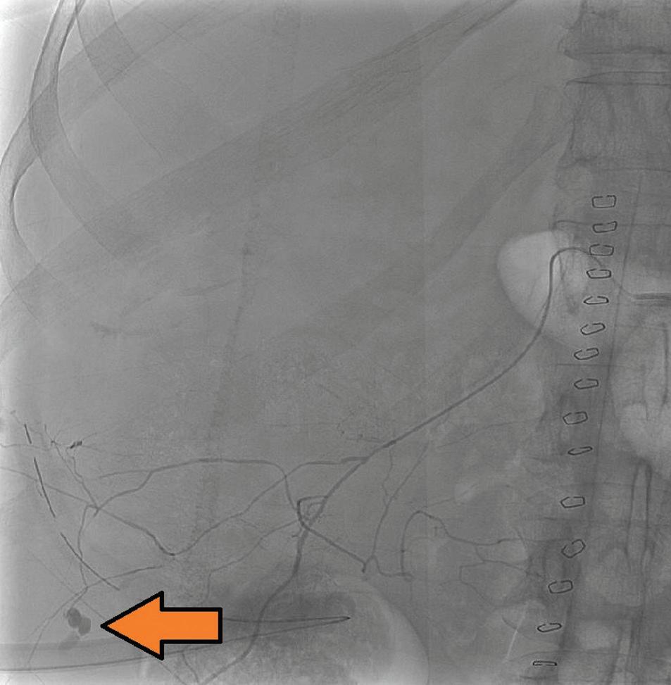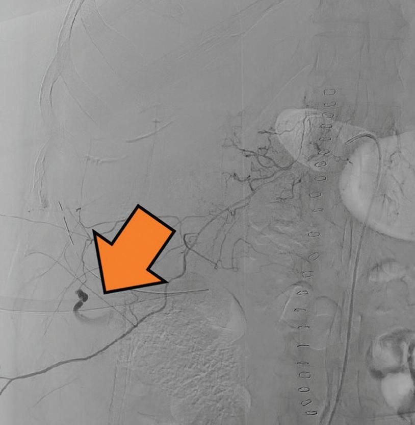Vasographic obliteration of a bleeding back muscle artery after bilateral nephrectomy of polycystic kidneys