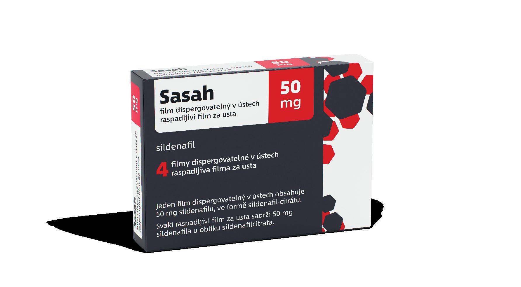 Zkrácená informace o přípravku: Sasah 50 mg film dispergovatelný v ústech. Složení: Jeden film dispergovatelný v ústech obsahuje 50 mg sildenafilu ve formě sildenafil-citrátu Indikace: Sasah je indikován k léčbě erektilní dysfunkce u dospělých mužů, pod kterou se rozumí neschopnost dosáhnout nebo udržet erekci dostatečnou k umožnění pohlavního styku. Pro dosažení účinku je nezbytné sexuální dráždění. Dávkování: Doporučená dávka je 50 mg, kterou je třeba užít podle potřeby přibližně jednu hodinu před sexuální aktivitou. Podle účinnosti a snášenlivosti lze dávku zvýšit na 100 mg nebo snížit na 25 mg (síla dostupná v jiných lékových formách). Maximální doporučená dávka je 100 mg. Maximální doporučená četnost užití dávky je jedenkrát denně. Pokud je přípravek užit současně s jídlem, může dojít ke zpoždění účinku ve srovnání se stavem na lačno. Pacienti s těžkou poruchou ledvin či s poruchou jater by měli zahájit léčbu dávkou 25 mg, dle účinnosti a snášenlivost je možno dávku zvýšit až na 100 mg. Způsob podání: Film dispergovatelný v ústech. Lze užít s vodou. Kontraindikace: Hypersenzitivita na léčivou látku nebo kteroukoli pomocnou látku přípravku, současné užití s látkami schopnými uvolňovat oxid dusnatý nebo nitráty v jakékoli formě nebo současné podávání se stimulátory guanylátcyklázy. Sasah nemá být užíván muži, pro které není sexuální aktivita vhodná. Je kontraindikován u pacientů, kteří ztratili zrak v důsledku nearteritické přední ischemické neuropatie optického nervu, i u pacientů se závažnou poruchou funkce jater, s hypotenzí, s cévní mozkovou příhodou nebo infarktem myokardu v nedávné anamnéze a v případě známého hereditárního degenerativního postižení sítnice. Zvláštní upozornění: K určení diagnózy a možné příčiny a před určením farmakologické léčby je třeba u pacienta zjistit anamnézu a provést fyzikální vyšetření. Je nutno posoudit kardiovaskulární rizikové faktory, riziko vzniku priapismu, není doporučeno současné užití s jinými inhibitory PDE5, jinými typy léčby erektilní dysfunkce či s ritonavirem. Opatrnosti je třeba u současného užívání s alfa-blokátory a u pacientů s poruchami srážlivosti krve nebo aktivní vředovou chorobou. V souvislosti s podáváním sildenafilu byly hlášeny poruchy zraku. Významné interakce: Metabolismus sildenafilu je zprostředkován hlavně izoformou 3A4 a izoformou 2C9 cytochromu P-450 (CYP). Inhibitory těchto izoenzymů mohou snížit clearance sildenafilu a induktory těchto izoenzymů mohou clearance sildenafilu zvýšit. Fertilita, těhotenství, kojení: Přípravek není indikován k použití u žen. Hlavní nežádoucí účinky: Nejčastěji hlášenými nežádoucími účinky v klinických studiích byly bolest hlavy, návaly, dyspepsie, zduření nosní sliznice, závratě, nauzea, nával horka, poruchy vidění, cyanopsie a rozmazané vidění. Uchovávání: Žádné zvláštní podmínky uchovávání. Balení: Film dispergovatelný v ústech v sáčku z trojvrstvé laminátové folie, v krabičce po 2,4,6,8 nebo 10 filmech (na trhu nemusí být všechny velikosti balení). Držitel rozhodnutí o registraci: Novatin Limited, 230, Second Floor Eucharistic Congress Road, Mosta, MST 9039, Malta. Registrační číslo: 83/488/21-C. Datum revize textu: 24. 1. 2023. Výdej léčivého přípravku je vázán na lékařský předpis. Přípravek není hrazen z prostředků veřejného zdravotního pojištění. Podrobné údaje najdete v Souhrnu údajů o přípravku.