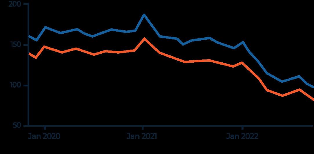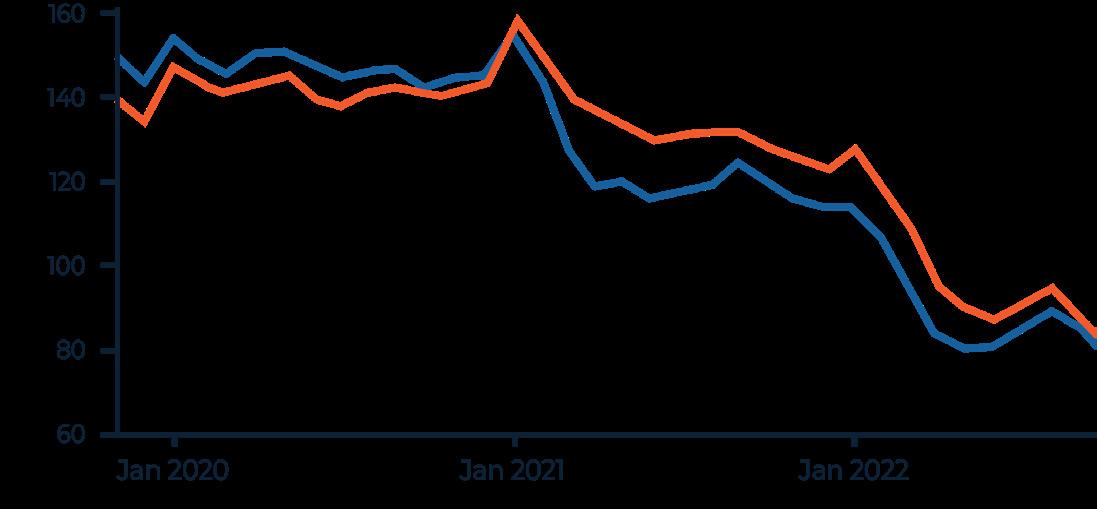 Home price growth was largely supported by the fall in interest rates from 2019 through 2021. An increase in the 30-year mortgage interest rate to 7% from the January 2021 low of 2.65% decreases the purchasing power of principle and interest payments by 40 percent. The same increase to 7% from