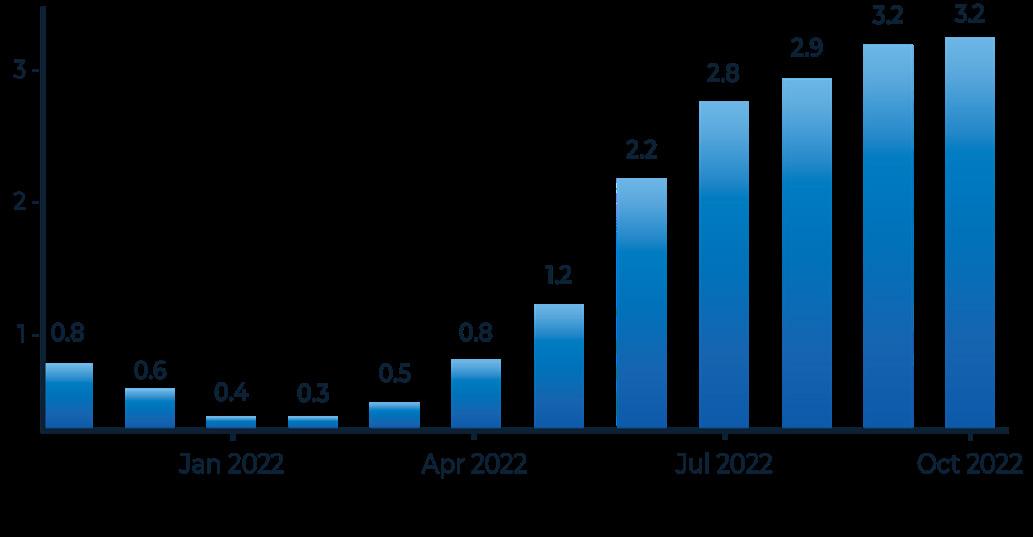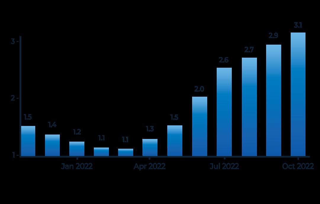 the mortgage interest rate's annual average will likely be higher in 2023 than it was in 2022. The recent increase in mortgage interest rates has been in response to both high levels of inflation and increases in interest rates from the Federal Reserve to combat inflation. Interest rates will largely follow a similar path as inflation with similar forecast risk factors.