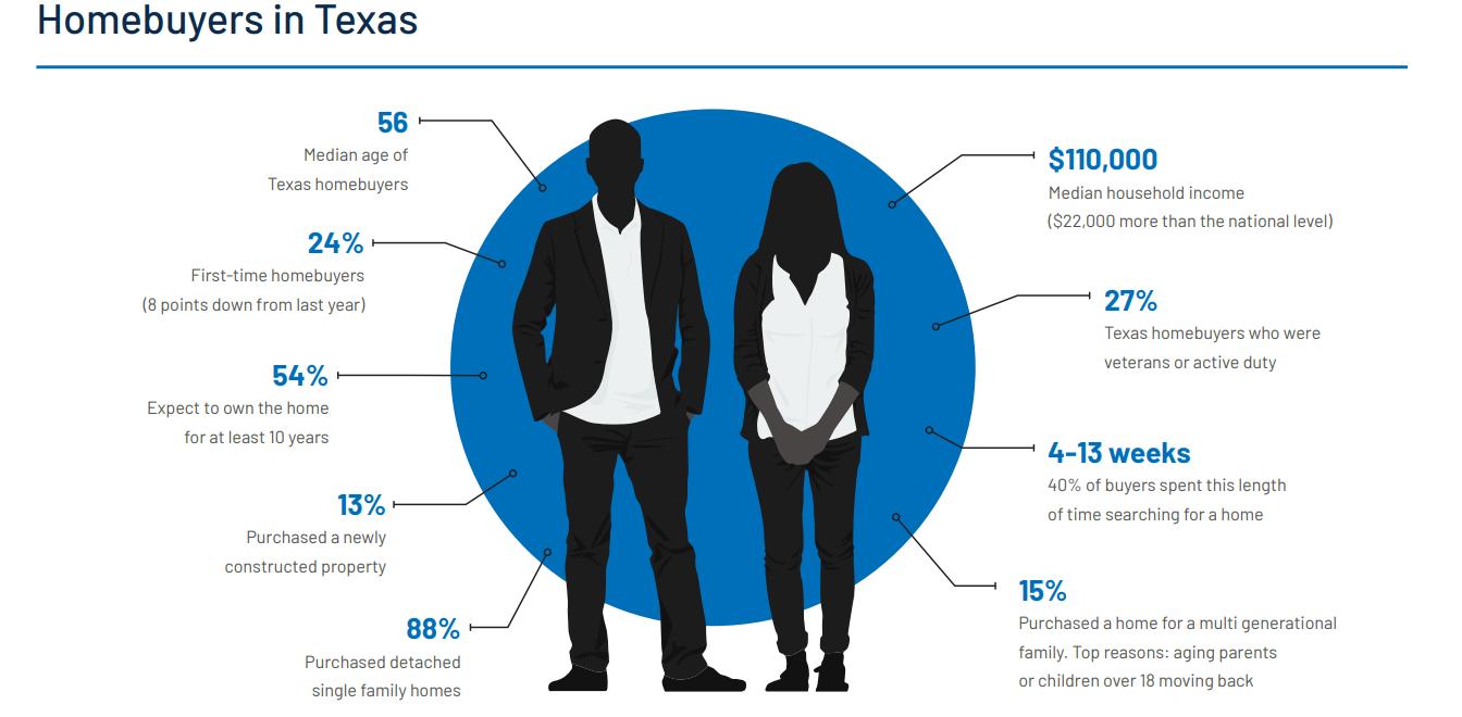 According to the report, there were fewer first-time homebuyers in Texas compared to previous years, at 24% of homebuyers, down from 32% last year and 39% a decade ago.