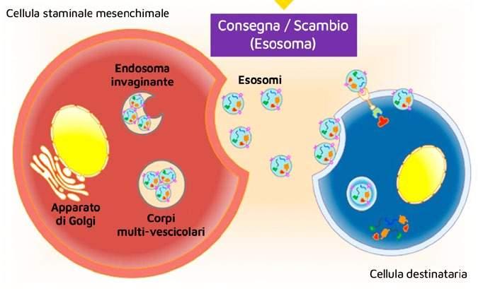 Gli esosomi sono reticoli endoplasmatici di dimensioni nanometriche, fondamentali per la trasmissione di segnali intercellulari nel corpo umano. Come secrezioni delle cellule staminali, essi ereditano i loro vantaggi e superano alcuni problemi legati all’utilizzo terapeutico di cellule intere: hanno infatti caratteristiche specifiche come le piccole dimensioni, la bassa immunogenicità, la lunga emivita in circolo, buona penetrazione e buona biocompatibilità. Attraverso il trasferimento di esosomi da una cellula all’altra, viene trasferito materiale genetico (RNAm, DNA, microRNA), ma anche le proteine e i lipidi necessari alla cellula per sopravvivere e svolgere le sue funzioni. Tutte le cellule possiedono esosomi, ma quelli delle cellule staminali in particolare sono i principali responsabili dell’effetto paracrino, che conferisce alle cellule la capacità di rigenerarsi.
