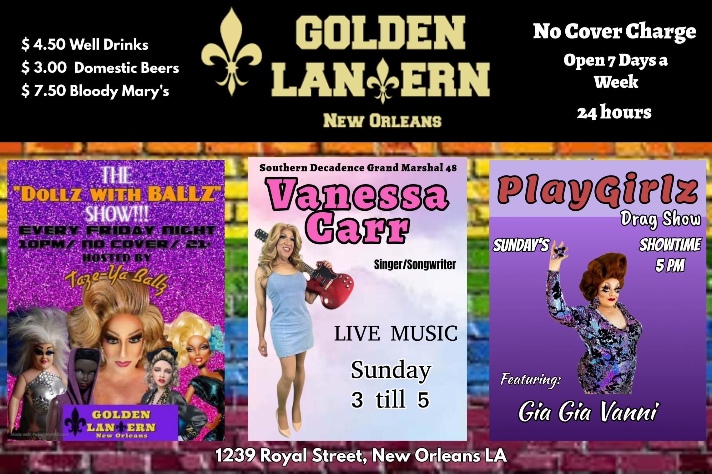 *The PlayGirlz Show: The Golden Lantern; 1239 Royal St.; 5 –7 p.m. Come out and enjoy the show featuring Gia GiaVanni with Taze Ya Ballz and a special guest each week.