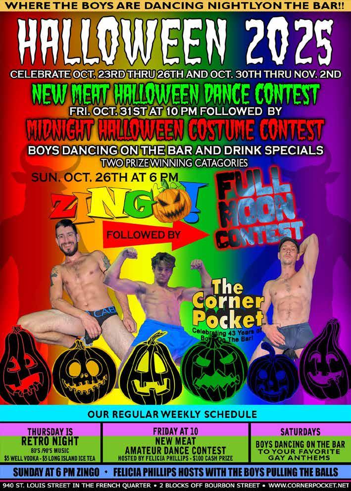 •The Famous Corner Pocket New Meat Contest; The Corner Pocket; 940 St. Louis St.; 10 p.m. (Boys dancin ’ from 7 p.m.).