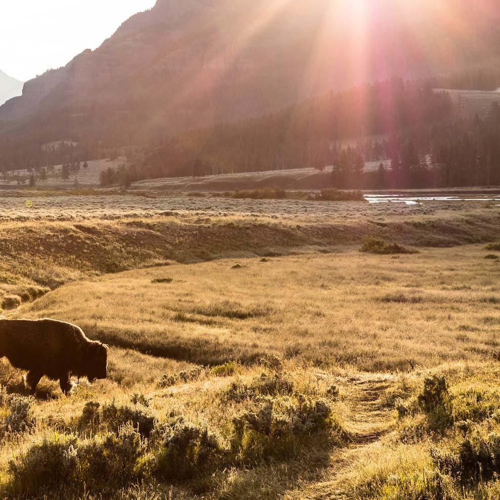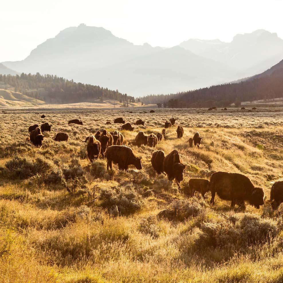 Bison and other wildlife like grizzlies, wolves, and elk roam freely in the expansive Lamar Valley, often called “the Serengeti of Yellowstone”—just a 30-mile day trip from Mountain Sky, with optional guided tours departing from the ranch.