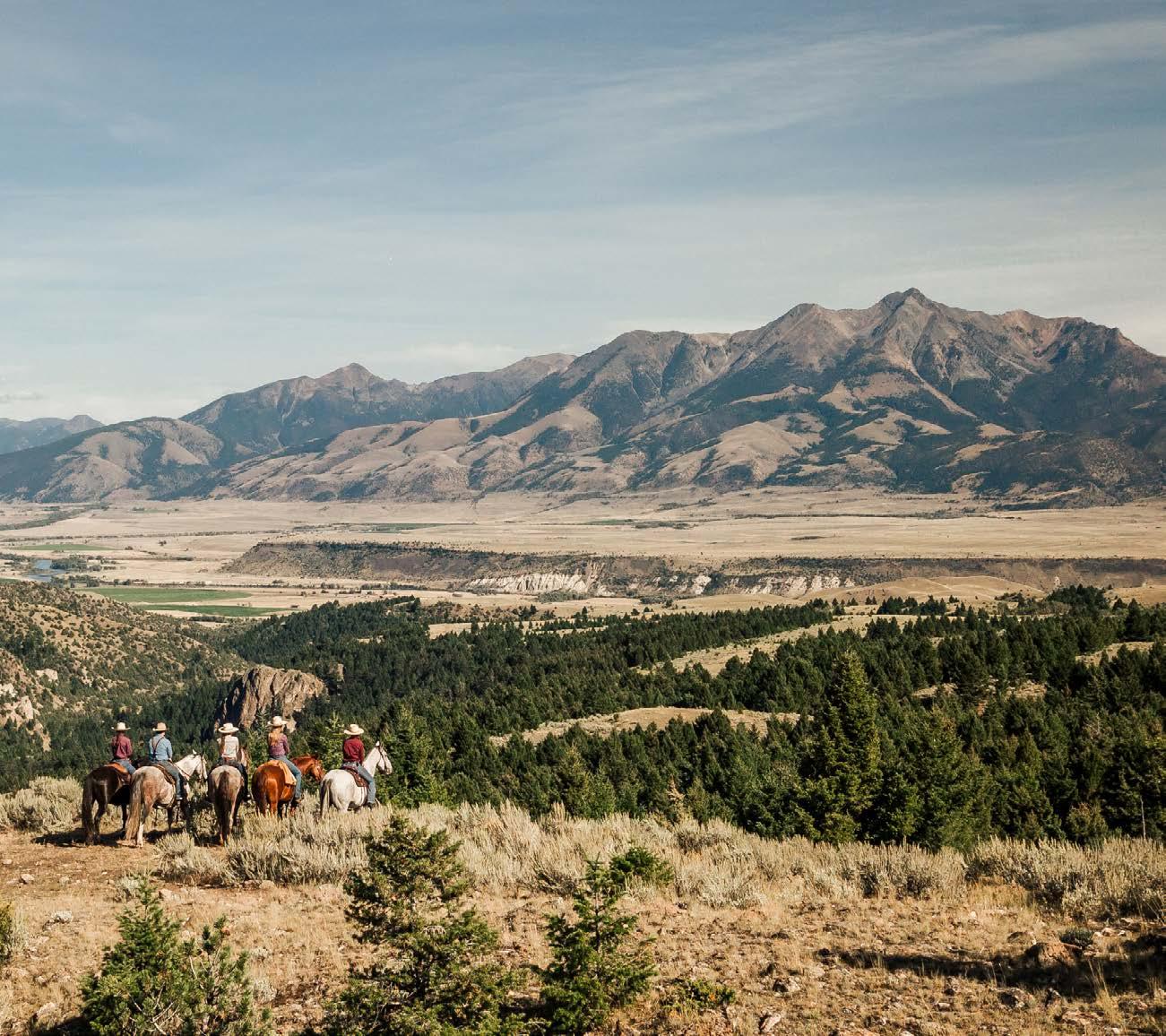 Mountain Sky Guest Ranch guests enjoying views of Emigrant Peak and Paradise Valley from horseback.