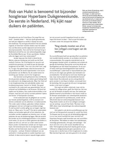 Rob van Hulst is benoemd tot bijzonder hoogleraar Hyperbare Duikgeneeskunde. De eerste in Nederland. Hij kijkt naar duikers én patiënten. Het gebeurde aan de Costa Brava. De jonge Rob van Hulst – fanatiek duiker – had zijn studie geneeskunde een half jaar stilgezet en werkte in Spanje als assis tent-duikleraar. Hij werd geconfronteerd met een dodelijk ongeval, en twee keer moesten duikers naar het zieken huis van Barcelona worden afgevoerd met de beruchte decompressieziekte. Toen wist hij het. Eenmaal terug in Nederland schreef hij voor zijn wetenschappelijke stage de Koninklijke Marine aan: ‘Ik ben sportduiker. Hebben jullie iets liggen wat ik kan onderzoeken?’ 29 jaar lang was Van Hulst in dienst bij de Marine, waarvan twintig jaar als hoofd van het Duik medisch Centrum. Nu is de Kapitein ter zee-arts met verplicht pre-pensioen, en treedt hij aan als bijzonder hoogleraar bij het AMC. ‘Voor mij is de cirkel rond’, zegt hij. ‘In 1957, mijn geboortejaar, deed de beroemde chi rurg Ite Boerema de eerste experimenten in de recom pressiekamer van de Marine. Nu de oudste kamer ter wereld 55 jaar bestaat, word ik hier hoogleraar.’ Zijn leerstoel wordt gefinancierd door de Marine, die als grootste werkgever van duikers groot belang heeft bij onderzoek in de duikgeneeskunde. Maar Van Hulst wil in zijn hoogleraarschap ook nadrukkelijk zoeken naar kruisbestuiving tussen ‘marine’ en ‘kliniek’. Een goed voorbeeld is zijn onderzoek naar gasembolieën, het ver schijnsel van luchtbelletjes in de hersenen. Dit komt het vaakst voor bij duikers, door snelle drukverschillen in het lichaam, maar kan zich ook bij ‘normale patiënten’ tijdens een hersen- of hartoperatie voordoen. In het onderzoek naar de giftigheid van zuurstof, zijn tweede aandachtsgebied, vindt hij eveneens een slimme combinatie van de ziekenhuis- en duikerswereld. ‘Om onder water te blijven, gebruiken militaire duikers ademgassen met een verhoogd zuurstofpercentage. Te veel zuurstof is echter giftig voor je longen’, legt Van Hulst uit. ‘Maar wat is “te veel”? Om dat te onderzoeken hebben we technieken gebruikt uit het ziekenhuis, die normaliter worden toegepast op intensive care- en long patiënten die aan de beademing liggen. Met die technie ken konden we de ontstekingsparameters in de uitadem lucht meten. Zo zijn we er achter gekomen dat duikers in plaats van drie uur, wel vier uur onder water kunnen blijven zonder onomkeerbare schade aan de longen op te lopen. De komende jaren doe ik vervolgonderzoek.’ Bij alles wat Van Hulst doet, staat zuurstof – in overvloed of schaarste – centraal. Stralend middelpunt van zijn werkveld is ’s lands grootste en oudste hyperbare zuur stoftank. In deze enorme ijzeren capsule krijgen patiën