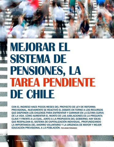 Mejorar el sistema de pensiones, la tarea pendiente de Chile Con el ingreso hace pocos meses del proyecto de ley de Reforma Previsional, nuevamente se reactivó el debate en torno a los recursos que disponen los chilenos para enfrentar y caminar en la última curva de la vida. Cómo aumentar el monto de las jubilaciones es la pregunta clave y frente a la cual, junto a la propuesta del gobierno, hay ideas que respaldan el sistema de capitalización individual, profundizando la importancia del ahorro voluntario y la urgencia de mayor y mejor educación previsional a la población. Por Airam Fernández