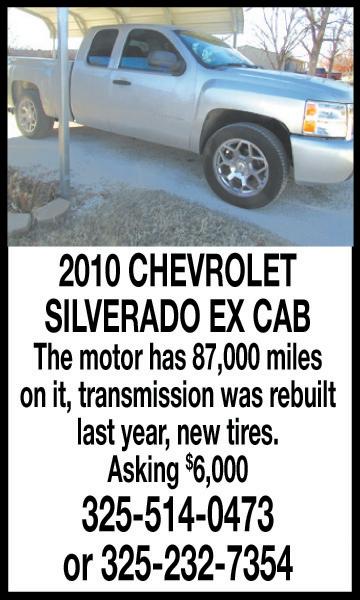 9252 30X50 BARNDOMINIUM $240,000 with 50x10 front porch, 4 Bedrooms, 1 1/2 bath, living room & 3 Windows, Concrete Slab, Plumbing, Electrical, Insulation, Septic Tank, Sheetrock, Paint & many more sizes. 325-675-0989, 325721-2750, 325-7947868 HOUSE LEVELERS Needed. Call 325-2086072 AMAZING GRACE REMODELING. No Job To Small. Specializing In Exterior Painting, Flooring, Carpet, Tile, Wood, Vinyl, Painting, Drywall, Texture, Plumbing etc... Free Estimates!!! Call Charlie 325-660-2655 2012 CHEVY Tahoe Best Buy Auto, 325-4373677 (We Finance) NO CREDIT CHECK. NICE 1953 Golden Jubilee. rare 3 speed Sheman Trans! $4700 325-668-9049 325668-9049 EXPERIENCE GOD’S Love At Old Paths Baptist Church. 3501 Chimney Road Road Abilene, Texas. 79606 325-333-7326 www.opbca.org WILLOW PARK Apts 1 bedroom All Bills Paid/ Pricing starting at $699 *some restrictions apply* 2 bedroom All Bills Paid. Prices starting at $859 *some restrictions apply* Welcome! Key Property Call 325-690-0123.