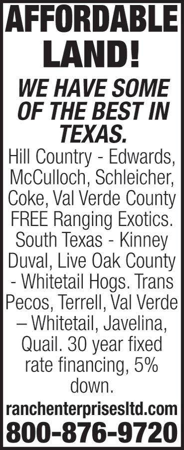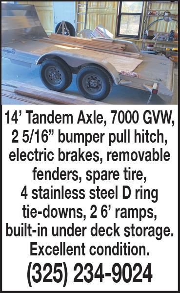 AMMO AND Crossbow for sale. 325-2016027, Larry. LIVESTOCK MINIATURE FEMALE Donkey for sale. Call 325365-0338 ALFALFA FOR SALE Price delivered to you. Barn stored. 806-474-8791 WANT TO buy JUNK vehicles, running or not. Must have title. 325-5140427 - GET SOME CASH TODAY!! AMCLASS ABILENE.COM 14 SPRING-CALVING Angus/Brangus cows, gentle, three to six years old, delivery and pics available. 325-200-9705. ANGUS BULLS & Females for sale! Hogue Cattle Company (325) 646-6568 Days / (325) 6432225 Evenings ANGUS BULLS - AI Sired, EPDs, performance and fertility tested, guaranteed! DeLeon, TX (254) 842-9866 cell – (254) 8936427 FARM & RANCH 3 ACRES of good Farm/Ranch land near Caps/Abilene, Texas. 10 year lease. Can support up to 3 horses or cows. Good Farmland. Contact Jim Badgett 214-478-0515. Lease $200 per month. jlbfirehouse@hotmail.com SMALL ACREAGE SERVICE: Mowing, Plowing, Fence, Row Clearing FREE ESTIMATES 325-668-5972 GWET OILFIELD SERVICE & SUPPLY Rods, Tubing, Casing & Pump Jacks. Pump Rebuilds & Service Work. Call Gene 325-338-0185, Scotty 325-668-4882 CROSSOVER LARGE Toolboxes, good condition $200 each obo. 325-3380185 L SHAPE Fuel Tanks, good condition $200 each. 325-338-0185 30X30 $110,000 BARNDOMINIUM, concrete slab, Plumbing, Electrical, Insulation, Septic tank, sheetrock, Paint, 2 bedrooms, bathroom, kitchen. Many more complete sizes. 325675-0989, 325-7212750, 325-794-7868 BILLY’S DIRT & CONSTRUCTION Backhoe Work, Septic Systems, Lot Clearing, Demolition. Billy Bilbrey - Owner 325-338-4018 SAND PIT Hawley, Tx. Can Sell Sand by the Truck Loads C.R. 334 Hawley 325-669-1296 Kirt Keen PUMP & Installation of Septic Systems, Dump Trucks, Back Hoe Service. Installation of conventional or chamber systems for leach field. 325668-2712 BULLDOZER WORK Any type Farm & Ranch, Residential or Oilfield. Roads built, Fence lines, Stock Tanks, Dug or Cleaned. 40 years experience. 325-676-0304 ED KINNEY TRUCKING Gravel, Sand, Topsoil, Driveways, Tractor. Mobile 325-668-4491 COTTON SEED BS&D598. $60 per bag, 200 bags available. 21 Crop, good germ. 325575-9900 Snyder. FREE HOUSE • 1341 N. 7th Street, 3bd, 1bath • Must See!!!! - (HOUSE MUST BE MOVED). Serious Inquiries Only; CALL or TEXT 325-669-3278. DUMPTRUCKS DRIVEWAYS & ROADS BUILT & REPAIRED. Topsoil, Gravel & Bin 10 Hauled, Tandems & Belly Dumps, Dozers, Motorgraders, Loaders, Box Blades. 40 years experience. 325-676-0304 HPS- PLASTICS. Silage/Bunker Covers, Silage Bags & Machines, Multi-Purpose, Plastic Sheeting, Pond Liners. 254-977-4443 254967-9985 6545 S. US Hwy 377 Stephenville, TX.Made in the USA. FARM/HEAVY EQUIP TEXSTAR SEA Containers - INSTANT STORAGES! Sizes 20’s - 40’s * 866/468-2791, San Angelo TX 1950 8N Ford Tractor with shredder. Has been converted to 12 Volt & Electronic ignition. New radiator & 2 New Front Tires! $2,500 - Call 325-6683301 T & S CAKE FEEDERS, New and Used; 750 Pounds — 3000 Pounds; In Stock— Will Ship Anywhere. 806/681-4534 250 MILLER Bobcat Welder - Runs good / Asking $5,000 - Call or text: 254-488-1350 2 SAWS, Table & a Miter Saw / Table $80 / Miter Saw $50 / For more information, please call 325-4550289 OIL FIELD EQUIPMENT USED 3 1/2” lined tubing, 9.9 pound per foot, L80 clean $6.50 a foot. 325-338-0185 NEW 3 1/2 LFS Integral thread 8.8 pound per foot. $10 a foot. 325-338-0185