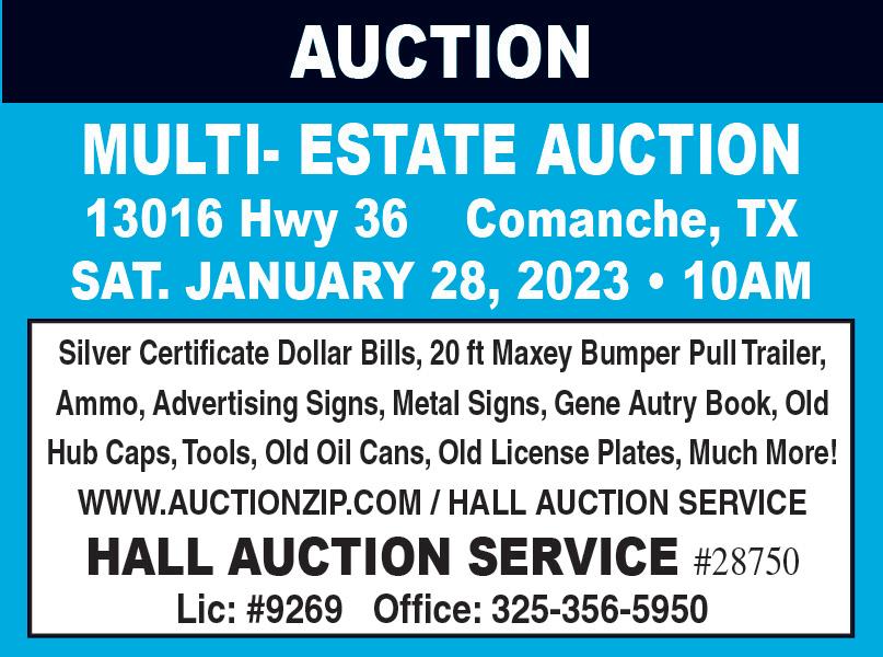 FARM & RANCH, SHEEP, GOATS, HORSES, HEAVY EQUIPMENT & MUCH MORE! 325-673-4521 10430813 Saturday Jan 28,2023 10am VIEW: 9:30am @ 1905 Cottonwood, Abilene, TX 79601 Oilman’s Office Furniture/Files/Maps/Logs/Etc. There are 100’s of MAPS of area counties/leases/lands. Office Desks/Credenzas/Bookcases/Office Chairs; Regular & Legal Metal File Cabinets; Metal & Oak Map Cabinets; Drafting Table, Light Table, Computers, Ext Cords/Power Strips/Phone Cords/Misc Cords; Shredder, Note Books, Office Supplies, 100’s File Folders, Trash Cans, Geology/Oil Related Books; Floor Protectors, 4’x 8’ Wipe Boards, Map Rack, Sooo MUCH MORE!! ++ Also Electrical Supplies as: Breakers/ GFI Breakers/ Sockets/Switches/Switch Plates/Light Bulbs, More! LOTS & LOTS OF TOOLS: Cement Working Tools, Saw Blades, Drills, Tool Boxes of Tools, Wrenches/Sockets/Combo & Open End Wrenches! Air Impact/Chisel Set, Grinder Blades, Hole Saw, Tool Sets, Propane Tank, Beer Keg?, Cutting Torch Attachments, MORE YARD: Champion Generator, Yard Vac, Elect Start Weedeater, Elect Mower, Yard Tools/Décor, Lawn Chairs, Coolers, Others; MISC/FURN: Lots Smalls, Knick Knacks, Dishes, Cookie Jars, Children’s/Other Books, Still Unpacking; Elect WheelChair, Elect Jazzy Scooter; China Cabinet, Leather Loveseat, Occ/Decorative Chairs, QS Bed/Dresser/NS; Wood Box, More! ++++++++++++++++++++++++++++++++++++++++++ Pics on web@kashauction.homestead.com EstateSales.NET or Auction Zip 46759 FB: KASH or KINCAID AUCTION SERVICE HOUSE +++++++++++++++++++JKincaid TX 6987+++++++++++++++++ KINCAID AUCTION 325-676-4077 or 800-446-5282 ichard’s Auction Service Auction Jan. 28th 1905 11th Street Snyder, TX 9:00 am View Photo Gallery online CONSIGNMENT EQUIPMENT AUCTION Entertainment center-2 pcs 6x7x10; Metal patio table 60x 84; 8 pc tile top patio set - Table, 6 chairs & umbrella stand; 10 pc patio set w/cushions - Table, 8 chairs w/red cushions & umbrella stand; Metal patio table; Outdoor patio recliner; 6 black outdoor chairs; Armoire cabinet /computer desk; Antique record player/radio; Hutch; Desk; Buffet; Patio set- 2 rockers & table; Outdoor recliner; Outdoor patio set - Table w/6 swivel chairs; Dresser w/mirror; 2 end tables; King Headboard w/ frame; 2 end tables & coffee table Glass top; 4 leather covered chairs Full catalog, terms, and online bidding at: https://Proxibid.com/richardsauction Richard’s Auction Service Richard Reed TX LIC# 17599 325-575-2064 AuctionZip.com View Photo Gallery Auction Listing http://www.richardsauction.com 10430770 3 DAYS OF ESTATE SALES! MR. & MRS. KEATHLEY 2134 OLD ORCHARD RD. ABILENE, TX Conducted By: 325-665-1262 (Fri.) January 27th • 12:00-3:00 (Sat.) January 28th • 8:30-3:30 (Sun.) January 29th • 12:00-3:00 Like and Follow Us on Facebook! 10430806 AUCTION For More Info Call: 325-370-1111 or 325-214-1556 BIG COUNTRY AUCTION CO. ABILENE, TX AUCTIONEER LIC. # TX12058 Jeff Vaughn Visit our Facebook page for details. 10430827 Saturday Feb. 4, 2023 • 10 AM 175 PRIVATE RD 4242 HEAD WEST OUT OF COLEMAN, TX ON HWY 153 HODGES HORD’S CREEK RANCH WESTERN ART • FURNITURE HOME DECOR • MOUNTS TRACTOR • EXCAVATOR & SO MUCH MORE!! TEXAS BUY Needing to Place Your Ad All Over Texas. For more info Call Helen @ 325-673-4521