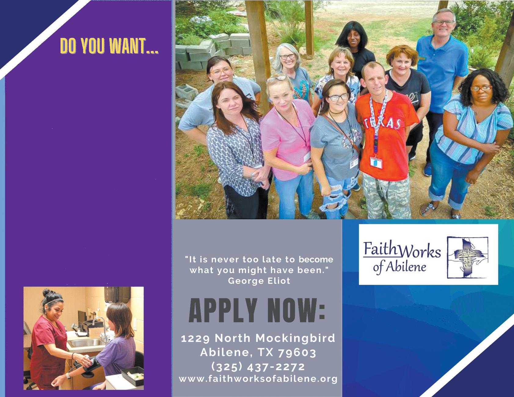 Apply today: 1229 N. Mockingbird 325-4372772. www.FaithWorksofAbilene.org