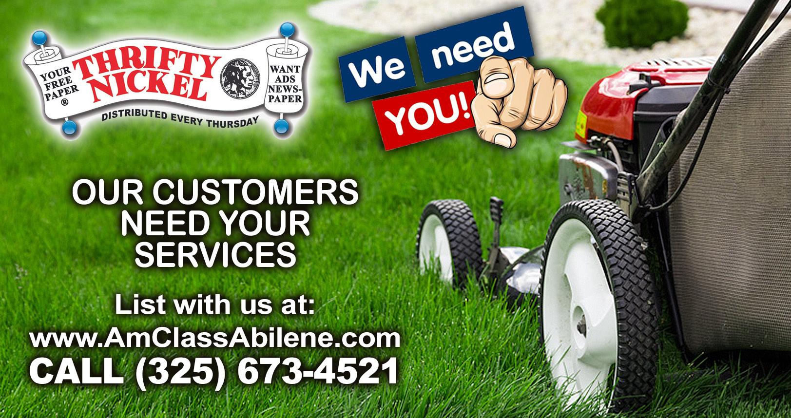 BUY Needing to Place Your Ad All Over Texas. For more info Call Helen @ 325-673-4521 WEST TEXAS SPECIAL We Can Place Your Ad in 6 Cities in West Texas. For more info Call Helen at 325-673-4521 ADVERTISE HERE! 325-673-4521 AmClassAbilene.com SUBMIT YOUR AD BY TUESDAY 6:00PM AMERICAN CLASSIFIEDS Thrifty Nickel Open Monday thru Thursday (Closed on Fridays)