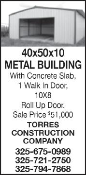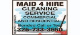 Direct Support Professionals Needed 10431961 10431351 “It is never too late to become what you might have been.” - George Eliot SUMMER 2023 CLASS BEGINS Tuesday May 30, 2023 Fall Class Starts Mid-September APPLY NOW: 1229 North Mockingbird Lane Abilene, TX 79603 (325) 437-2272 www.faithworksofabilene.org FAITHWORKS SUCCESS REQUIRES: DETERMINATION! COMMITMENT! MOTIVATION! Need a Job? CLYDE NURSING CENTER Please come by for an On The Spot Interview to 806 Stephens Street Clyde, Tx 79510 325-893-4288 EOE LVN’s • RN’s • CNA’s All Shifts NOW HIRING: New Wage Scale for LVN’s, CNA’s and RN’s 10431483 EOE 10431613 CHIP SPREADER OPERATOR WANTED: Road construction crew. Paid health insurance and other benefits. Per Diem. 1-830-833-4547 NOW HIRING EOE 10431577 CDL Drivers with Tanker & Hazmat preferred Equipment Operators Laborers Health Insurance and other benefits. Per Diem Paid. 1-830-833-4547 Candy Cakes! 266 CYPRESS ST. • Abilene, TX www.McKaysBakery.com 325.672.9737 10431210 Call Today: 325-518-2261 10431958 NEED MOVERS! Moving Company Hiring $14/hr with Drivers license, $13 without! We start at 7:30 a.m. HAUL AWAY My Son and I haul off unwanted Scrap Metal and Yard Sale Leftovers FREE. No Trash. 325-333-6272 325-333-6927