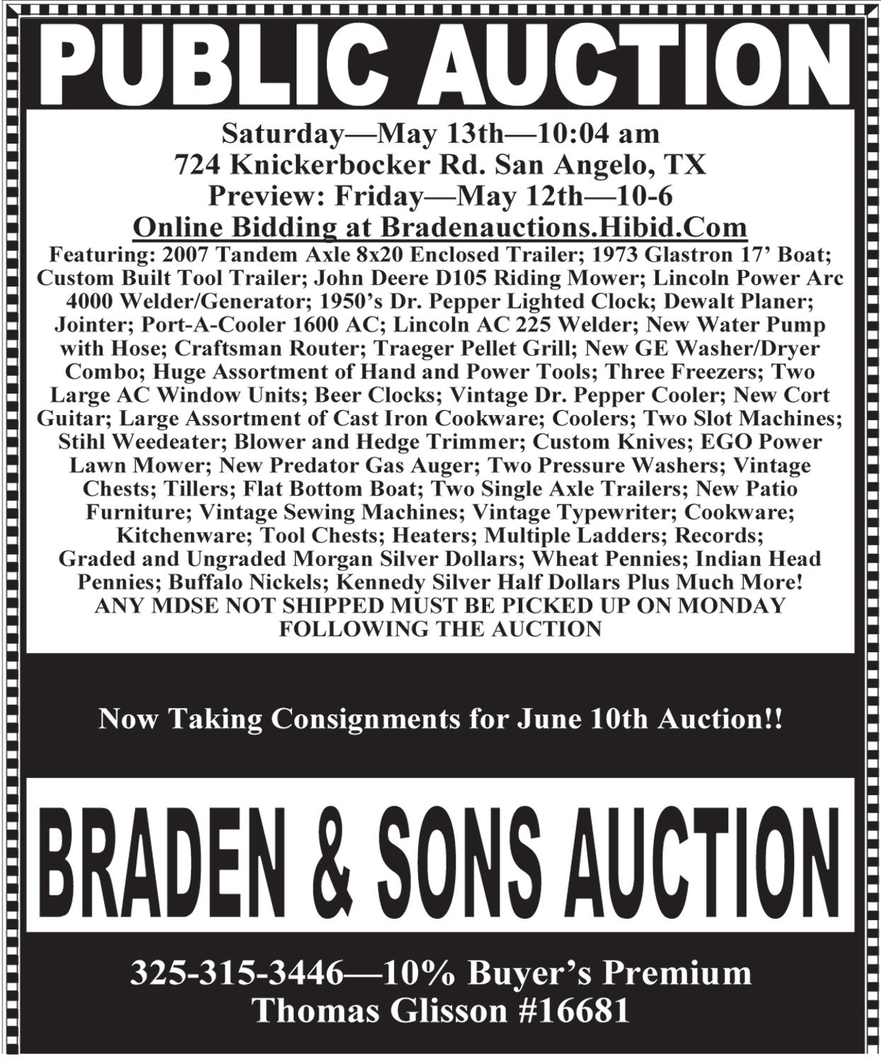 Plus Much More!!! - PLUSVery Nice Large Iron Grip Weight Machine Folks, Lots and Lots Here - Do Not Miss This Sale! ESTATE AUCTION For More Info Call: 325-370-1111 or 325-214-1556 BIG COUNTRY AUCTION CO. ABILENE, TX AUCTIONEER LIC. # TX12058 Jeff Vaughn Visit our Facebook page for details. 10432173 SUPER ANTIQUE FURNITURE AND GLASSWARE! Watch American Classifieds next week for a complete list. Sun. May 21, 2023 • 1 PM 3 ESTATES 881 E Hwy 80 • Abilene, TX RETIREMENT AUCTION For More Info Call: 325-370-1111 or 325-214-1556 BIG COUNTRY AUCTION CO. ABILENE, TX AUCTIONEER LIC. # TX12058 Jeff Vaughn Visit our Facebook page for details. Sat. May 20, 2023 • 10 AM DR. ALBRITTON 2501 S. Willis, Suite A • Abilene, TX DESK • FILING CABINETS • CHAIRS • OFFICE SUPPLIES • MEDICAL CABINETS • MEDICAL SUPPLIES • X-RAY MACHINE PLUS Several Super Art Pieces Watch for Complete Listing in Next Week’s American Classifieds. 10432174 10432119 Calendar What was I Thinking?? No Auction on Parade Night or Mother’s Day/Graduation!! 5-18 Storage Units/Misc @ 6pm View:5:30pm @ 1905 Cottonwood Ab,TX The building is double full! We will sell one side Thursday Night and the other side Saturday!! =================================== 5-20 Out of Town Estate & Furniture (Like New) @ 1905 Cottonwood Ab,Tx @10am Pics & List online & Next Week +++++++++++++++++++++++++++++++++ 6-3 Cross Plains ISD, Cross Plains,TX Handicap Bus, 8+ Pass Van, Pick-ups, Trailers, Shop Equip, Mowers, BBQ Grill, Score Boards, Desk/Chairs, Lots Misc!! Some Pics on KINCAID AUCTION & FB See You Soon!!! ==========JKincaid TXS6987=========== KINCAID AUCTION 325-676-4077 or 800-446-5282