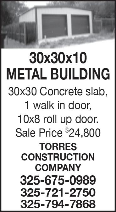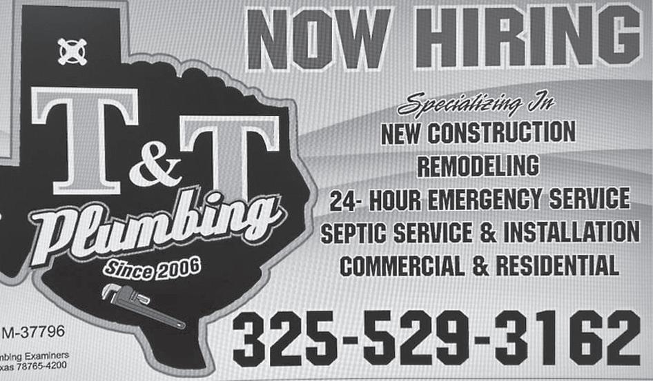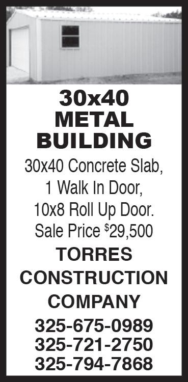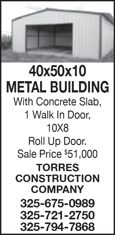 TX • CALL 325-677-8100 1500 SQ. Ft. 40x40 Barndominium $190,000. Concrete Slab, Plumbing, Electrical, Insulation, Septic Tank, Sheetrock, Paint & many more complete sizes. 325-675-0989, 325721-2750, 325-794-7868 CONCRETE COWBOYS Free Estimates! Specializing in Decorative Concrete. Concrete Staining, Designs/ Scoring, Stamping. We do Epoxy! Call Wes 325-794-8888 ELMDALE FLEA Market 5423 East Hwy 80 Opened 7 days a week. Antiques, Collectibles, Rocks Military, cast iron. More every week. 325-6697722 WYLIE ISD Now Hiring Full Time Bus Drivers. Must have CDL with a P and S Endorsement. Custodians Salary DOE Benefits + Insurance. Apply 6249 Buffalo Gap Road, 325-665-7375 (EOE) COUNTRY LIVIN Rv Park,Move-in ready Camper Rentals. Clyde, Tx.