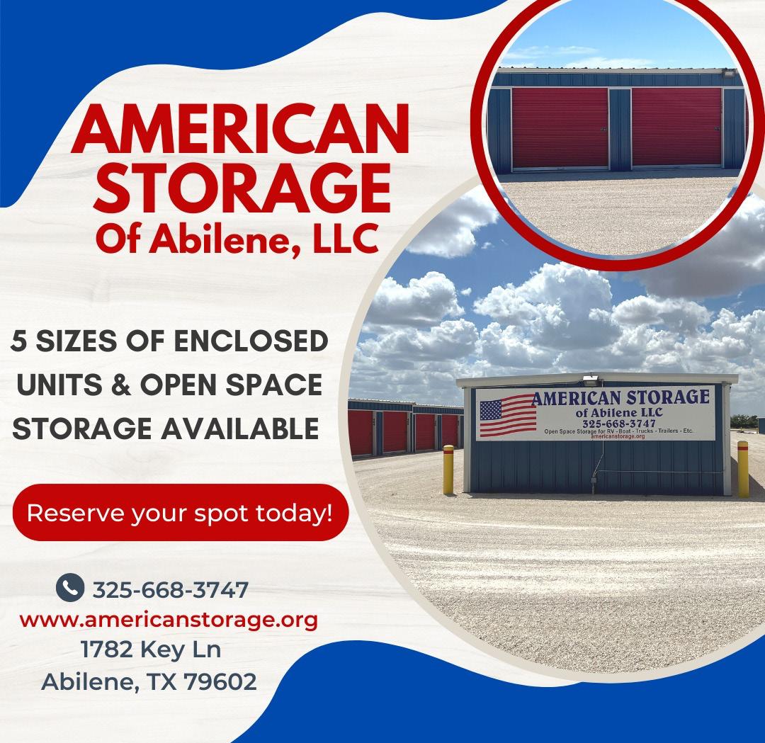 VIEW ONLINE • PLACE YOUR AD ONLINE • www.ThriftyNickelofAbilene.com Monday 8:30am - 4:30pm Tuesday 8:30am - 6:00pm Wednesday 8:30am - 4:30pm Thursday 8:30am - 4:30pm Friday CLOSED VOLUME 43 • ISSUE 26 • JUNE 29, 2023 (6/29/23 - 7/05/23) 3900 North 1st Suite 2 (325) 673-4521 HABLAMOS ESPANOL 40+ ACRES / PRIME LAND for SALE Located right off of Buffalo Gap Road, near Taco Casa. Selling at the right price for the right person. Call or TEXT for more DETAILS to 325-6693278 - if no answer, please leave message. 10432282 SONNY JONES WELDING 1902 N Treadaway • 325-672-1731 Mention Ad & get $10.00 Off Repairs • Alloy • Aluminum • Magnesium • Steel Repair & Straighten Cracked Wheels Blue J Landscape & Tree Service Trimming, Removal, Stump Grinding, Modern Landscapes. Insured, 21 Yrs Experience, FREE Estimates. Victor Hernandez 325-518-8031 10432428 Proud Partner of Abilene Chamber of Commerce ONLINE LIST: AmClassAbilene.com/garagesaleguide (updated Thurs. & Fri.) American Classifieds / Thrifty Nickel © (325) 673-4521 Call us to place your next ad. Remember, not everyone is on social media. Print Still Works! 10432189 HPS Liberty SafeS 6545 S. US HWY 377 STEPHENVILLE, TX 254-967-9985 Looking for A Bank Alternative? Weekend? Holiday? Bank Runs? Keep Your Money Available and SAFE! SAFE ACCESSORIES CONCEALED HANDGUN VESTS & PURSES FAMILY OF three looking for Deer Lease. 325-6778094 Quintin 2009 HARLEY Davidson Ultra Classic Electra Glide, black $8,900. 44k miles. Excellent condition. 325-6656106 2023 TRANSCEND, 1 slide, $45,000. 325260-4484 THE MALL OF ABILENE 325-695-3700 3532 NORTH 6TH STREET 325-704-3130 POKEMON • SPORTS CARDS COMICS • TOYS 10432729 BUY • SELL • TRADE Come Stay With Us! Monthly $750 and Weekly $322 (no tax) ROOM AMENITIES: FREE WIFI Microwave Refrigerator Cable TV Guest Laundry Facility Ground Floor Pet Friendly Trucking Surrounded by all kinds of Restaurants, Grocery & Liquor Stores and Hospital. 3210 I-20 & Pine St. • Abilene, Tx 79601 CALL: 325 677 2687 Always Deliver more than Expected Frontier Inn 10432184 Abilene State Supported Living Center 2501 Maple - AbSSLC.org 10432422 ✔Vacation Time, Sick Time & Numerous Holidays ✔Health Insurance ✔Retirement Plan ✔Full-time hours ✔Morning, Evening & Night Shifts Are you an LVN looking to make a real difference for others? Consider joining our team! LVN’s $4,594.16 - $4,866.58 a month! 10432454 ★ STAINING ★ STAMPING ★ RESURFACING ★ EPOXY ★ SCORING “He is an Artist... His Canvas is Concrete!” SPECIALIZING IN DECORATIVE CONCRETE 10432615 New Renovated Room: Weekly $43.48 pn ( $350 including tax) 2 guests additional guest $50 per week extra. Weekly Full Payment in Advance *Subject to Availability FREE High Speed WiFi • FREE Microwave in Room • Pet Friendly (Pet Fee Applicable) • FREE Fridge in Room FREE Truck Parking 840 East Hwy 80 • ABILENE 79601 CALL 325-677-8100 No Deposit on cc $43.48 EconoLodge Inn & Suites GARAGE SALE GUIDE Thurs., Fri. & Sat. June 29th - July 1st 3273 Westchester Dr. ...........S.............. 8-11 Fri. & Sat. June 30 & July 1 3125 Sandefer St.................N................8A 1825 Clinton St.................. ..N...............7-12 __1726 Clinton St.......................N................ 8-1 __910 Midway.............................S.......... 7:30-3 __232 Weatherman Ln................S.............. 7-12 Saturday July 1 899 N. San Jose Dr..... .........N.................9-3 54 Augusta Drive......... .........S............7:30-? 254 N. 1st ... (Merkel, TX / Exit 270)........8-12 __222 CR 142...(Tuscola, TX)....................... 9-5 AUCTION GUIDE Thursday June 29 Beside the Post Office...(Tuscola , TX) .....10 am Sat. July 1 __2205 Butternut...........(Abilene , TX) .......9 am Sun. July 2 __589 EN 23rd..............(Abilene , TX) ........1 pm Coming! Sat. July 8 __510 Hamby Rd...............(Clyde , TX) ......1 pm Coming! Sunday July 9 __881 E Hwy 80..............(Abilene , TX) ......1 pm PLACE YOUR AD every WEDNESDAY by 11:00AM If you
